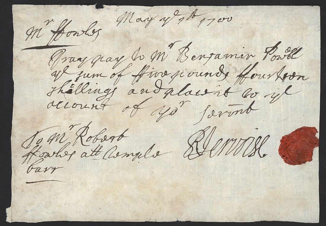 7th May 1700, instructs Mr. Robert Fowles to pay 5 Pounds 14 Shillings to Mr. Benjamin Powell;