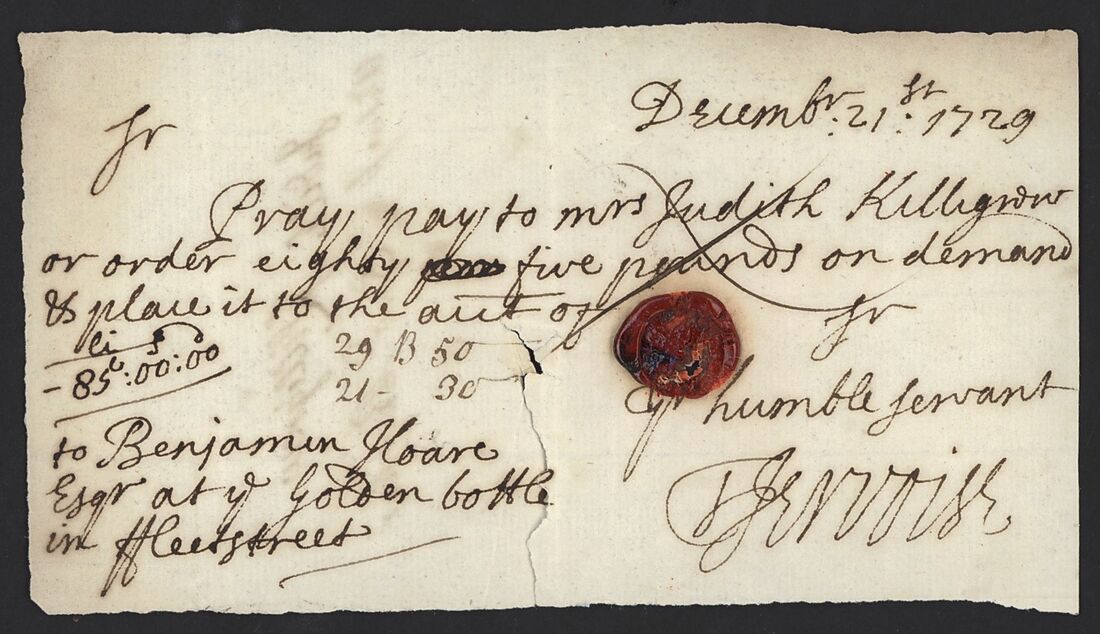 21st December 1729, instructs Benjamin Hoare Esqr. to pay £85 to Mrs. Judith Killigrew. This note also includes the address the Golden Bottle on Fleet Street, which together with the name Hoare identifies the bank in question as C. Hoare in Co., still extant today as the UK's oldest private bank