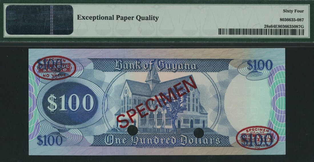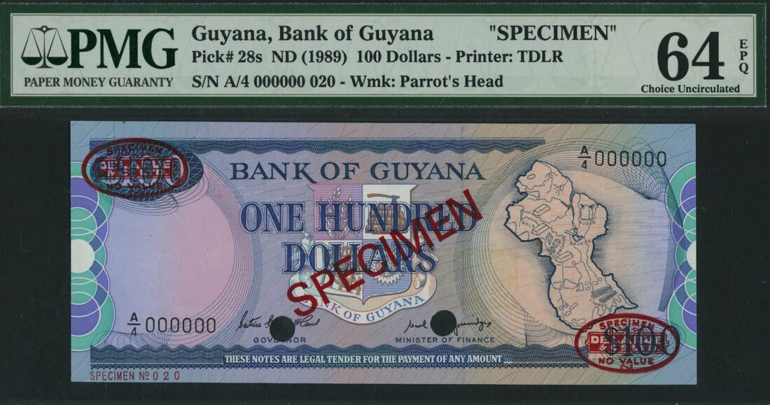 (x) Bank of Guyana, specimen 100 Dollars, ND (1989), serial number A/4 000000 020, (Pick 28s, BNB 106), in PMG holder 64 EPQ Choice Uncirculated