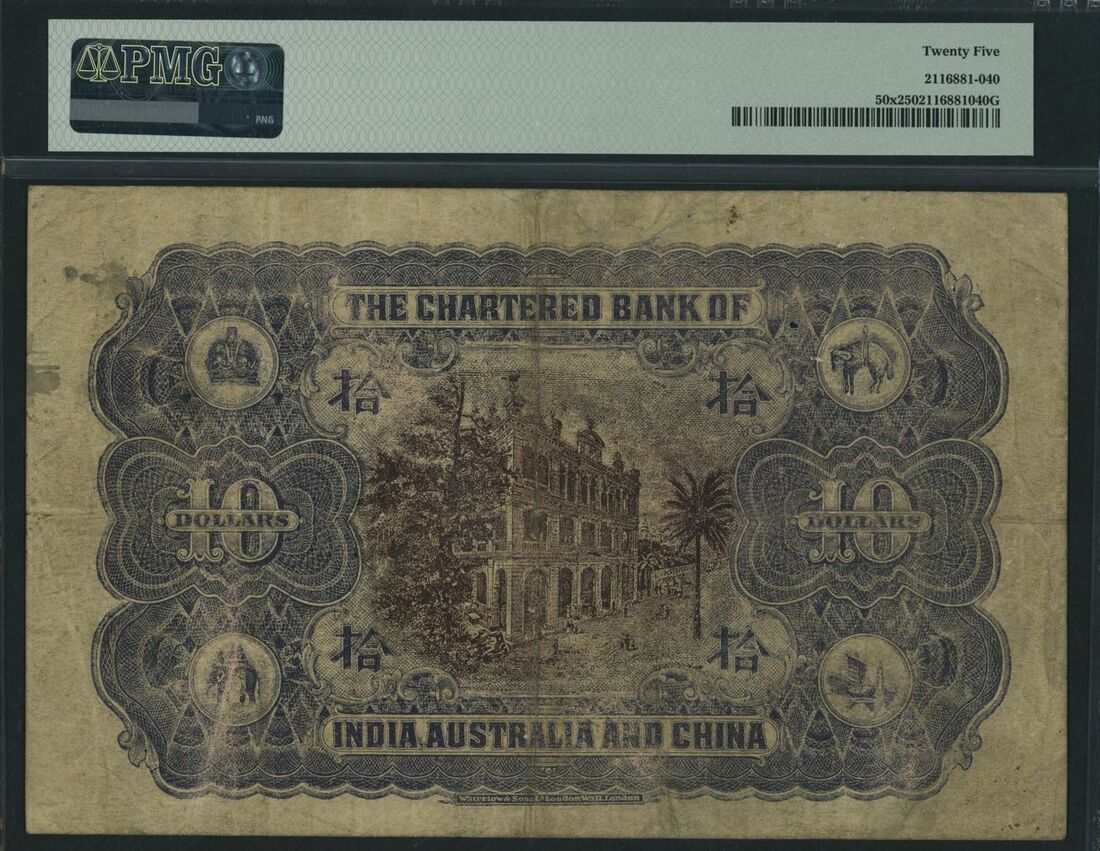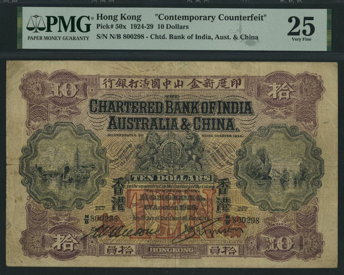(x) Chartered Bank of India, Australia and China, Hong Kong, contemporary counterfeit 10 Dollars, 1st August 1929, serial number N/B 800298, (Pick 50x), in PMG holder 25 Very Fine