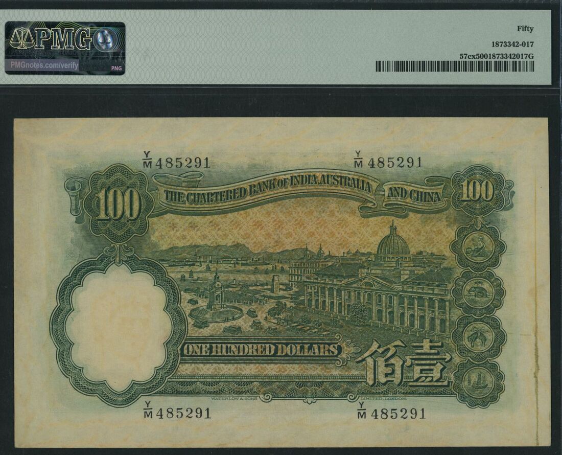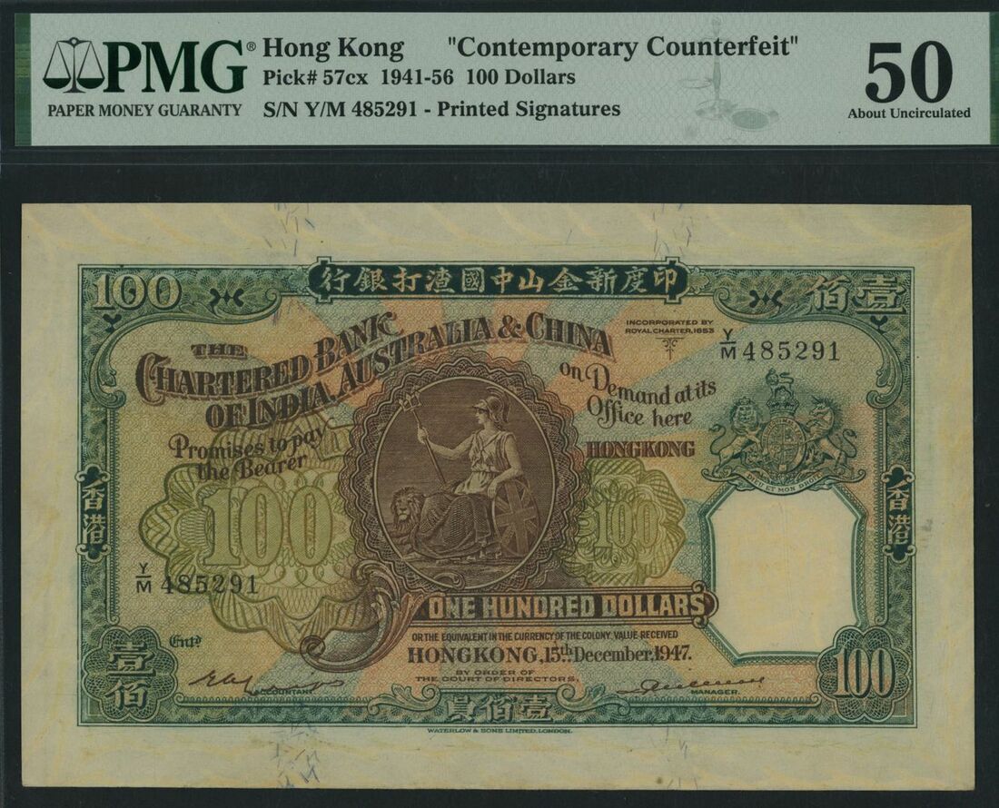 (x) Chartered Bank of India, Australia and China, Hong Kong, contemporary counterfeit 100 Dollars, 15th December 1947, serial number Y/M 485291, (Pick 57cx), in PMG holder 50 About Uncirculated