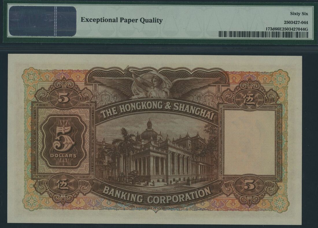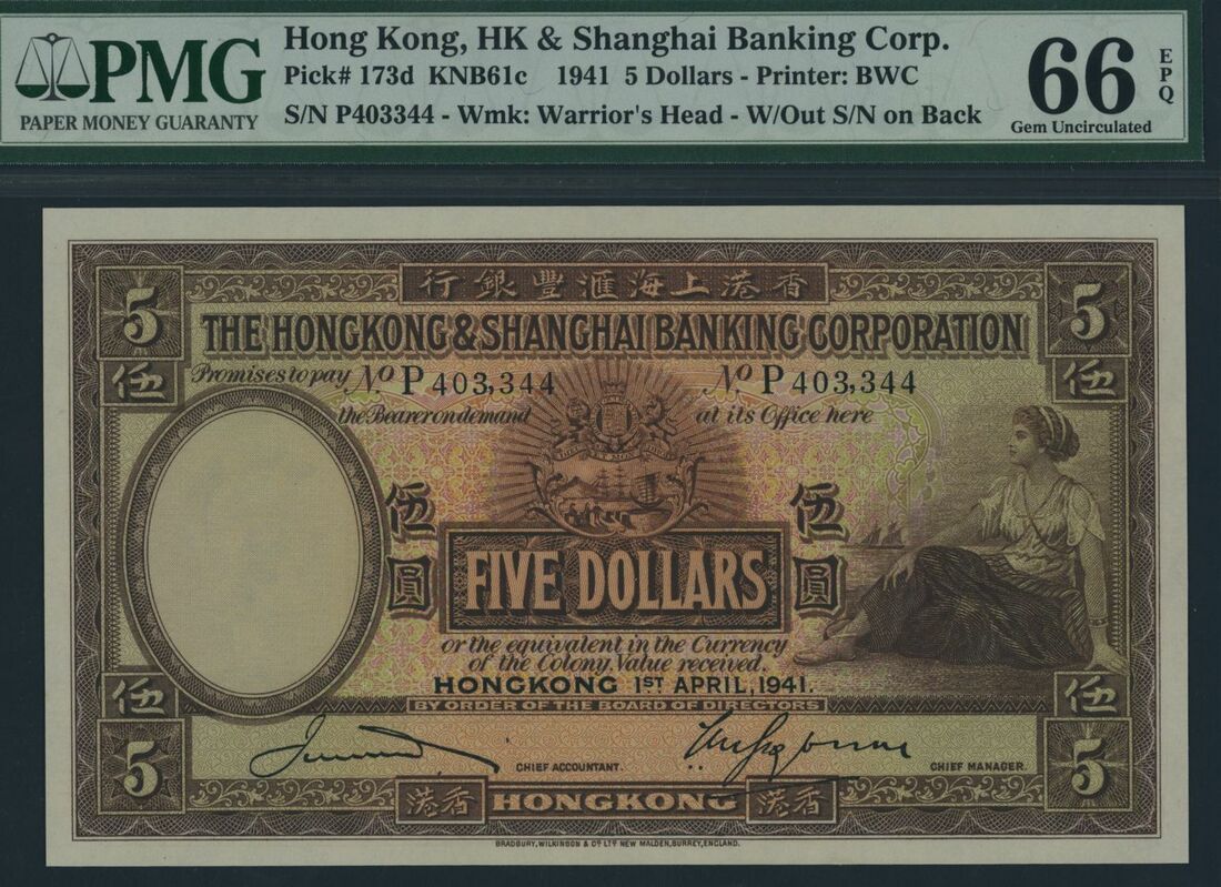 (x) Hong Kong & Shanghai Banking Corporation, 5 Dollars, 1st April 1941, serial number P403344, (Pick 173d, KNB61c), in PMG holder 66 EPQ Gem Uncirculated
