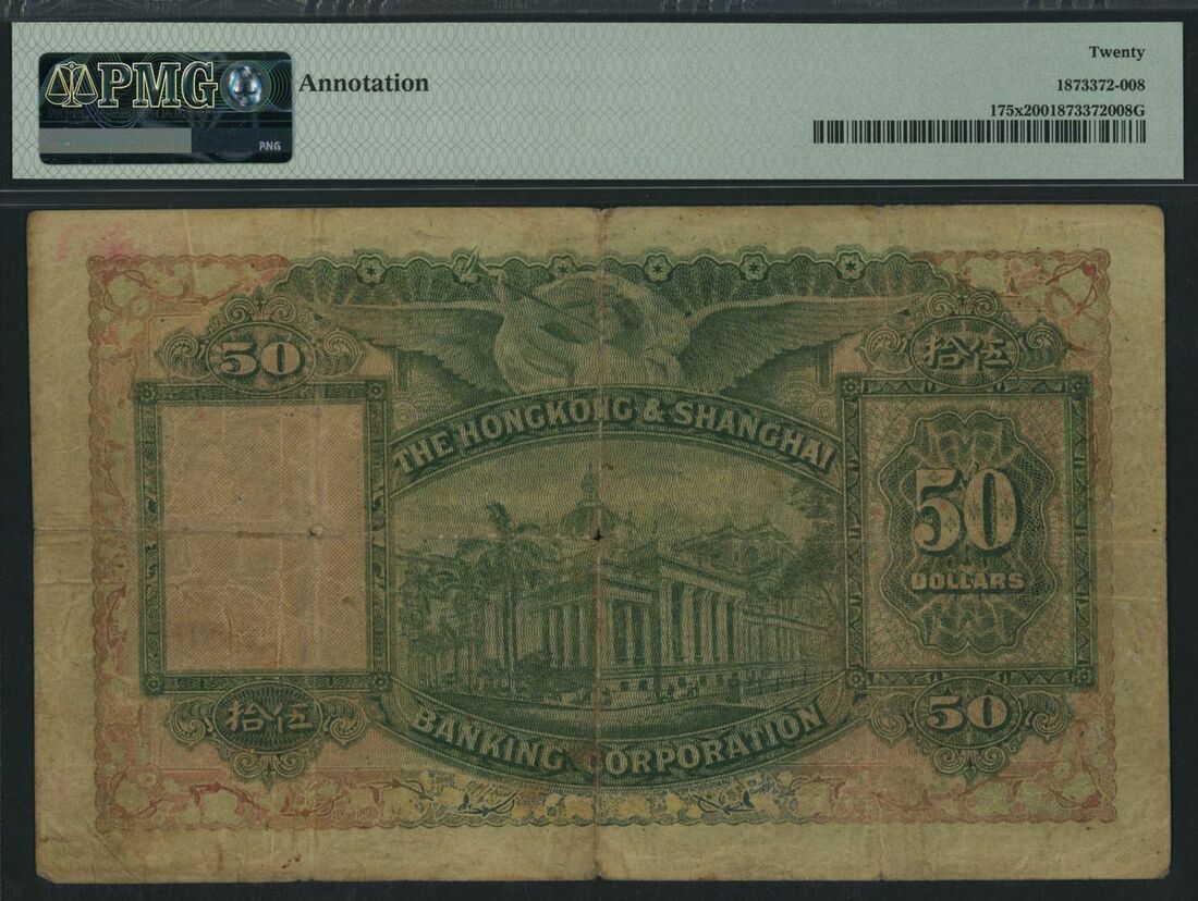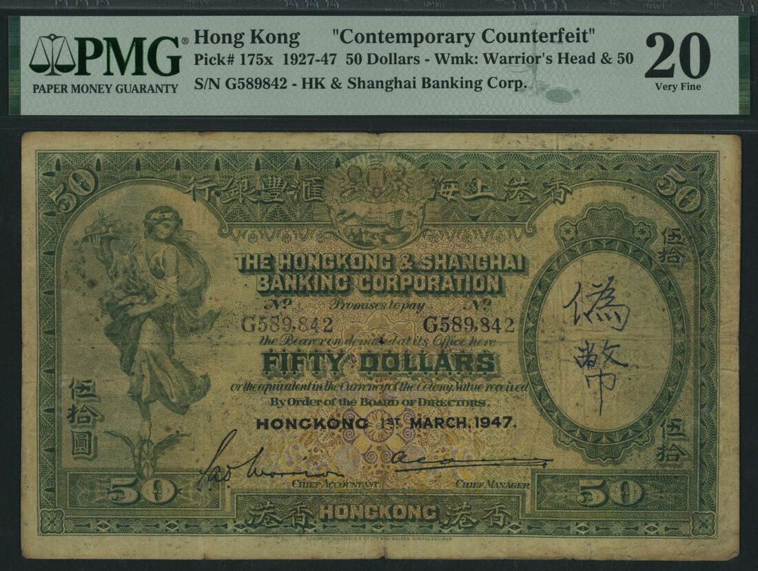(x) Hong Kong & Shanghai Banking Corporation, contemporary counterfeit 50 Dollars, 1st March 1947, serial number G589842, (Pick 175x), in PMG holder 20 Very Fine, annotation