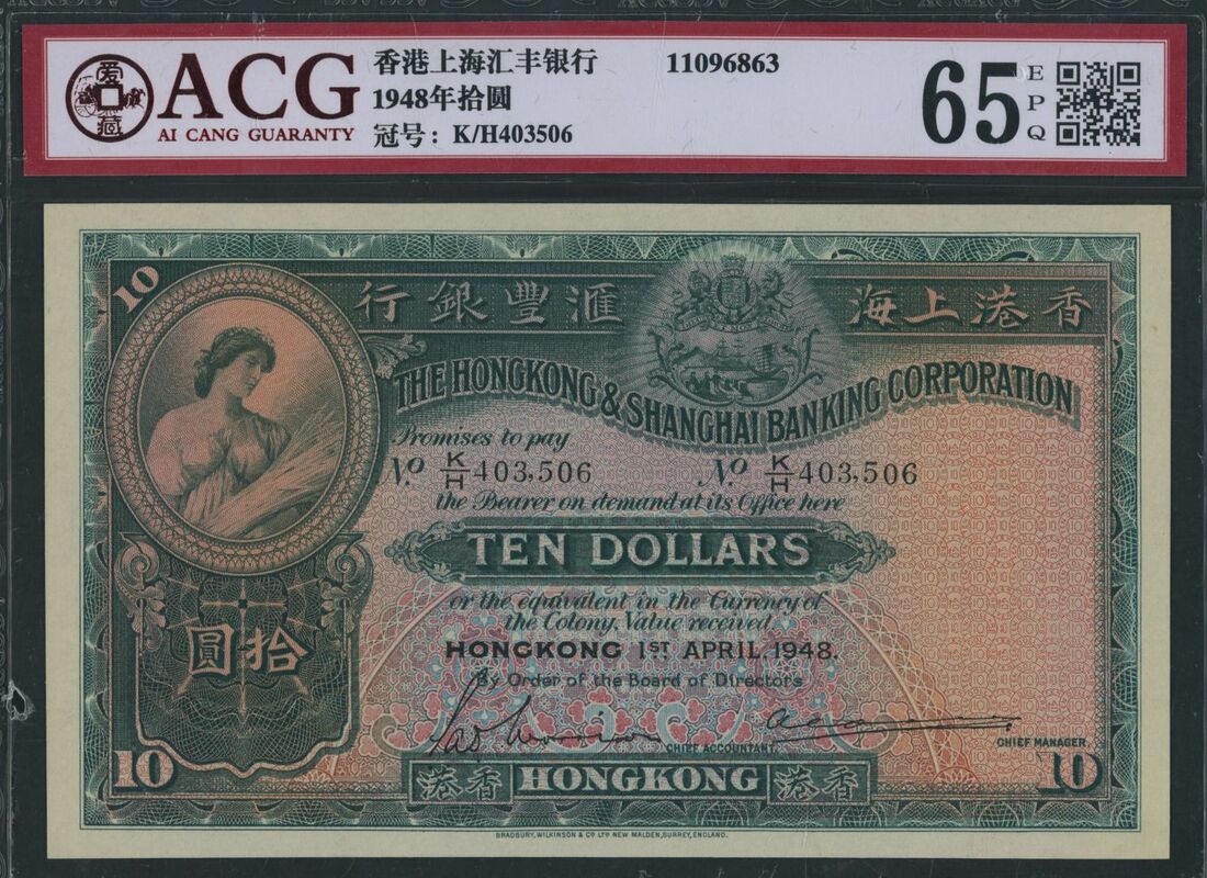 (x) Hong Kong & Shanghai Banking Corporation, 10 Dollars, Hong Kong, 1st April 1948, serial number K/H 403506, (Pick 178d, KNB 63b-d), in ACG holder 65 EPQ, only 5 notes graded higher on ACG census