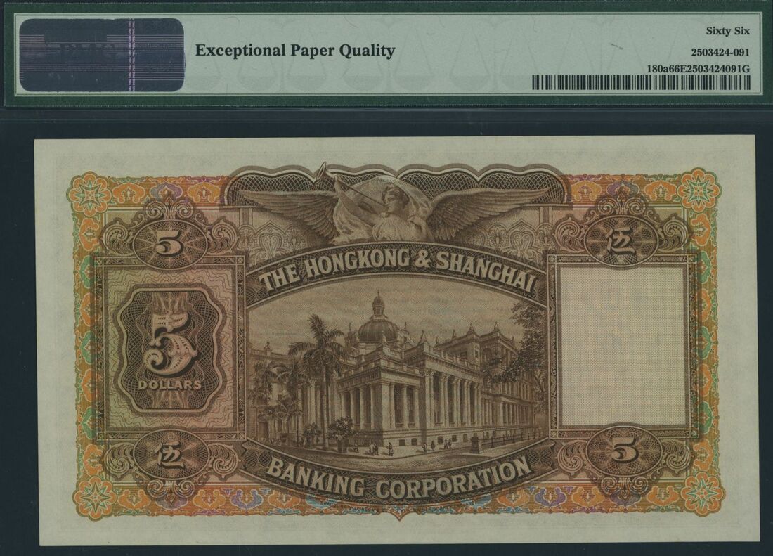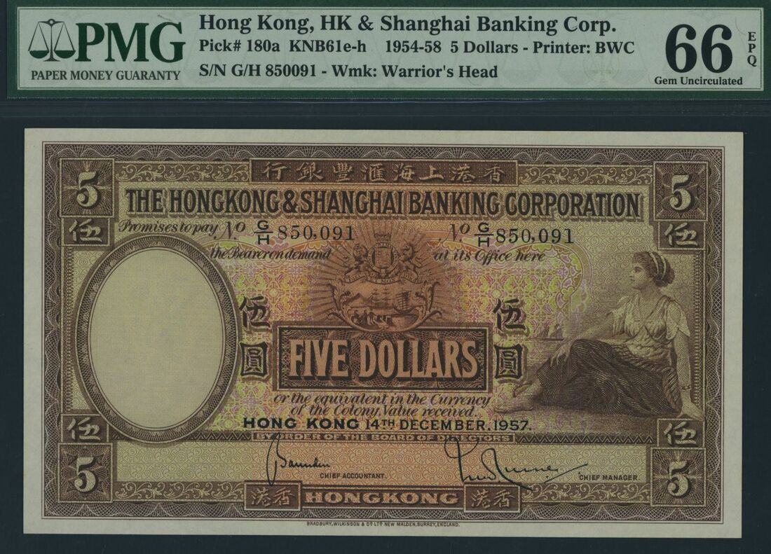 (x) Hong Kong & Shanghai Banking Corporation, 5 Dollars, 14th December 1957, serial number G/H 850091, (Pick 180a, KNB61e-h), in PMG holder 66 EPQ Gem Uncirculated
