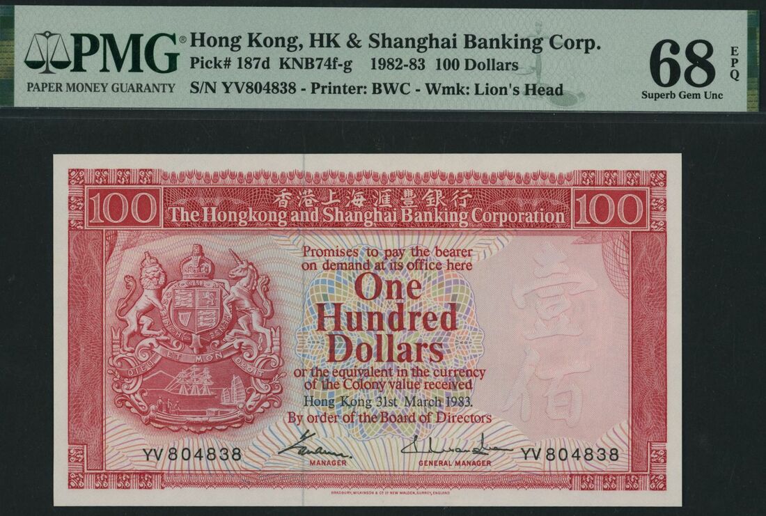 (x) Hong Kong & Shanghai Banking Corporation, 100 Dollars, Hong Kong, 31st March 1983, serial number YV804838, (Pick 187d, KNB 74f-g), in PMG holder 68 EPQ Superb Gem Uncirculated