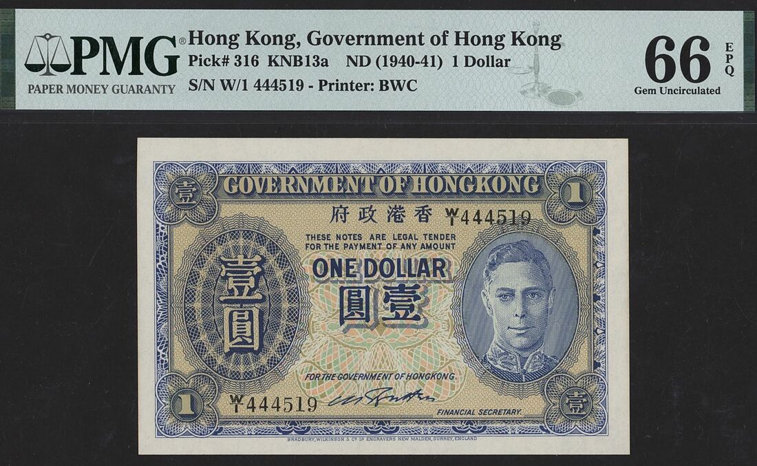 (x) Government of Hong Kong, 1 Dollar, ND (1940-41), serial number W/1 444519, (Pick 316, KNB13a), in PMG holder 66 EPQ Gem Uncirculated