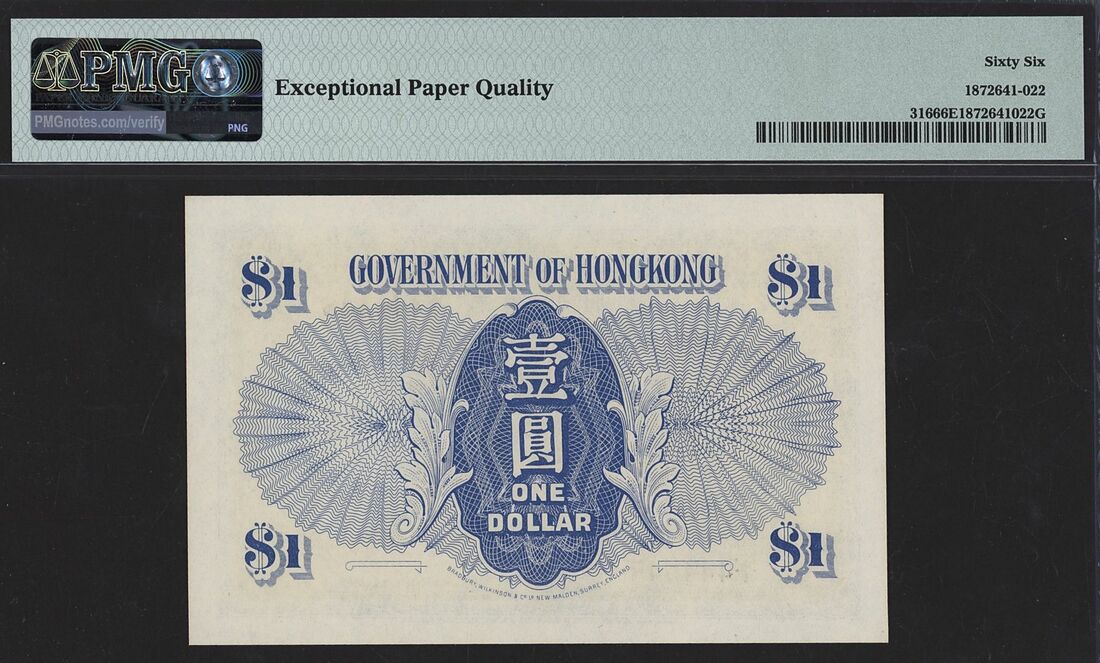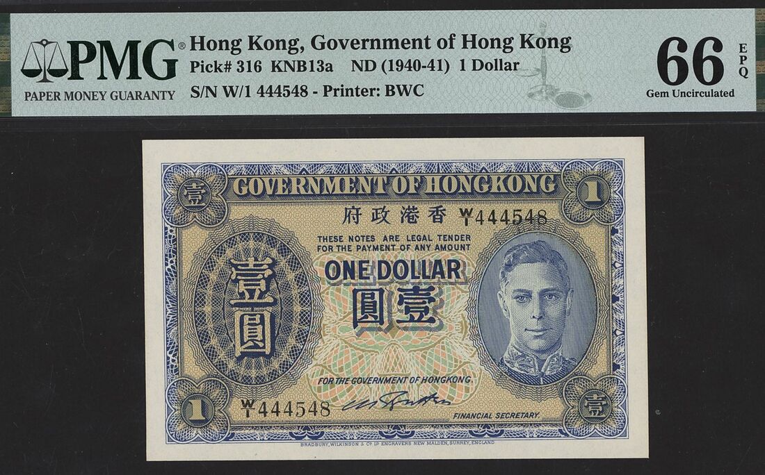 (x) Government of Hong Kong, 1 Dollar, ND (1940-41), serial number W/1 444548, (Pick 316, KNB13a), in PMG holder 66 EPQ Gem Uncirculated