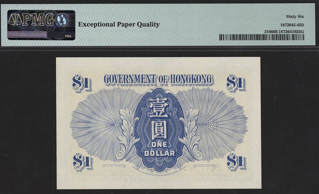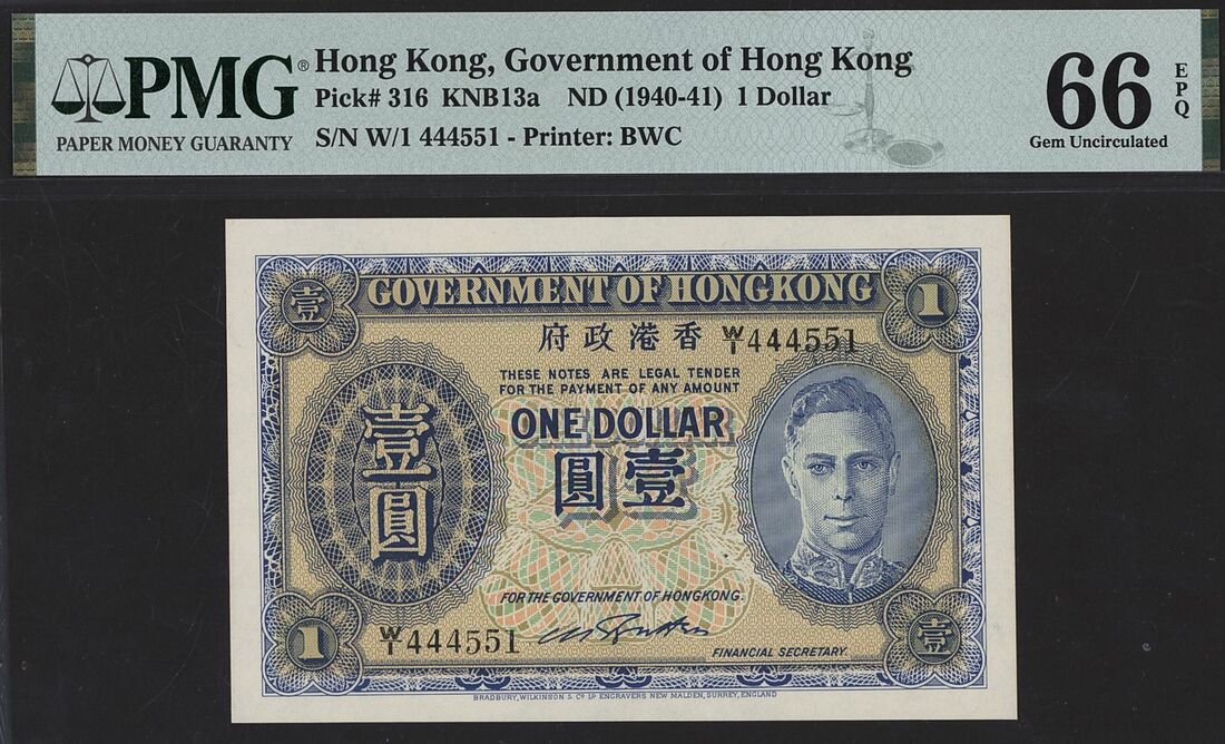 (x) Government of Hong Kong, 1 Dollar, ND (1940-41), serial number W/1 444551, (Pick 316, KNB13a), in PMG holder 66 EPQ Gem Uncirculated