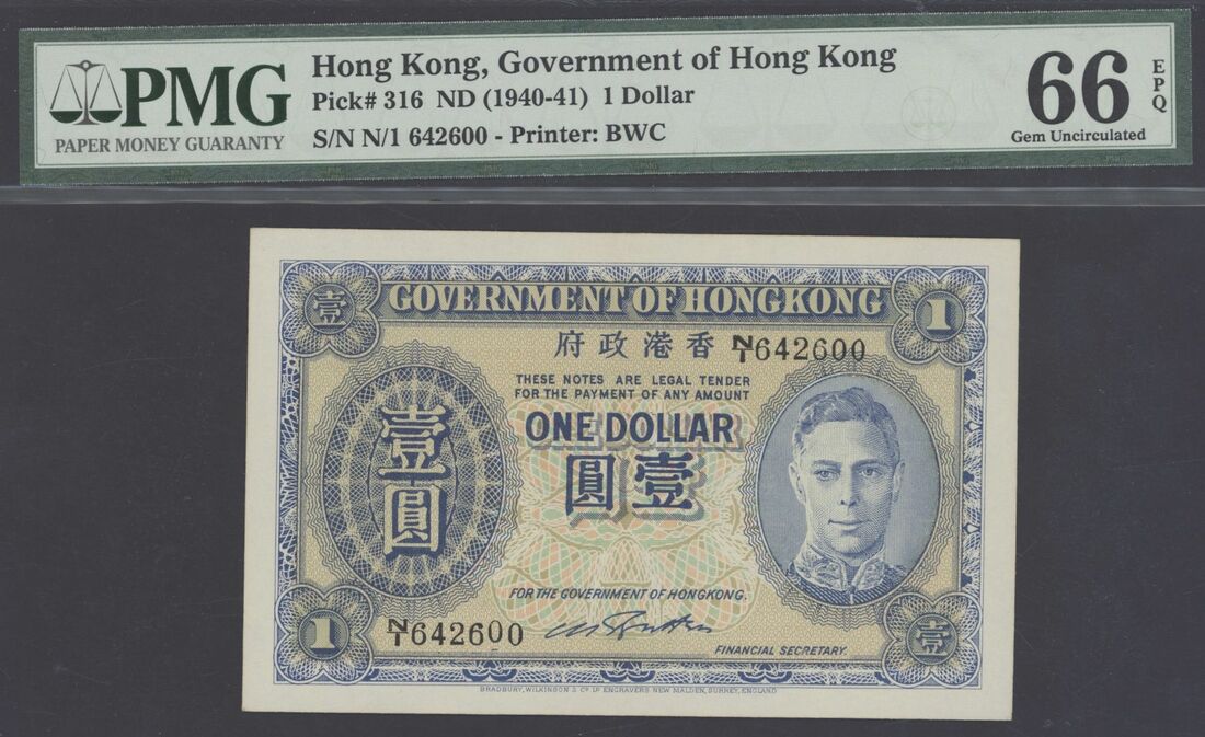 (x) Government of Hong Kong, 1 Dollar, ND (1940-41), serial number N/1 642600, (Pick 316, KNB13a), in PMG holder 66 EPQ Gem Uncirculated
