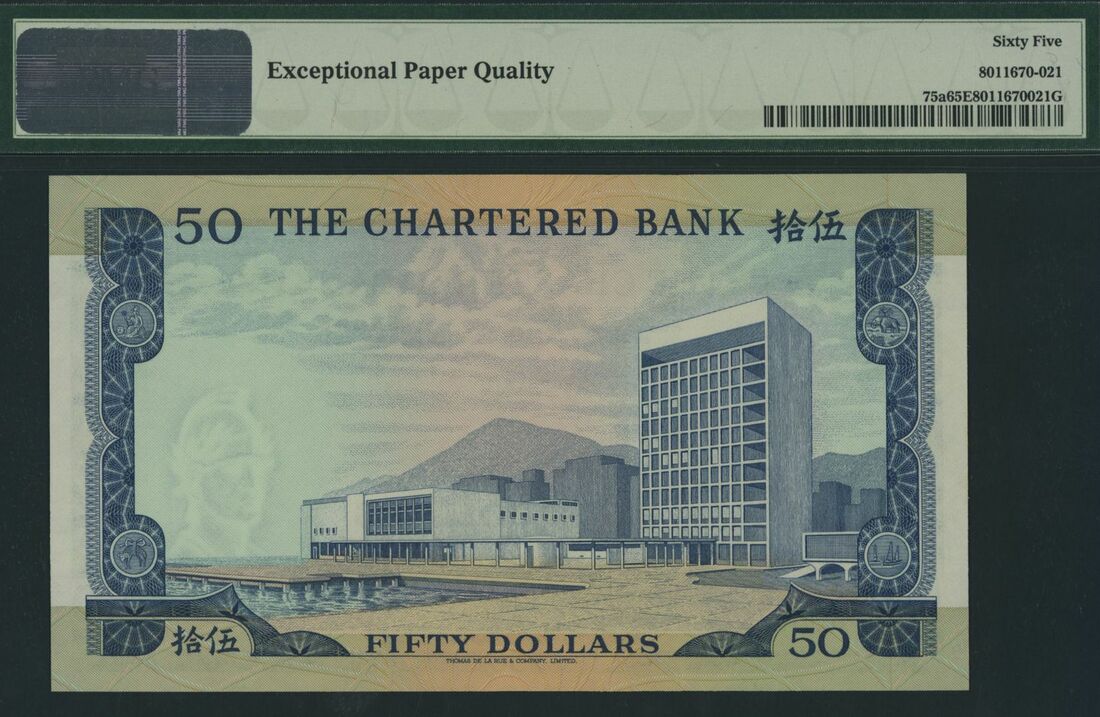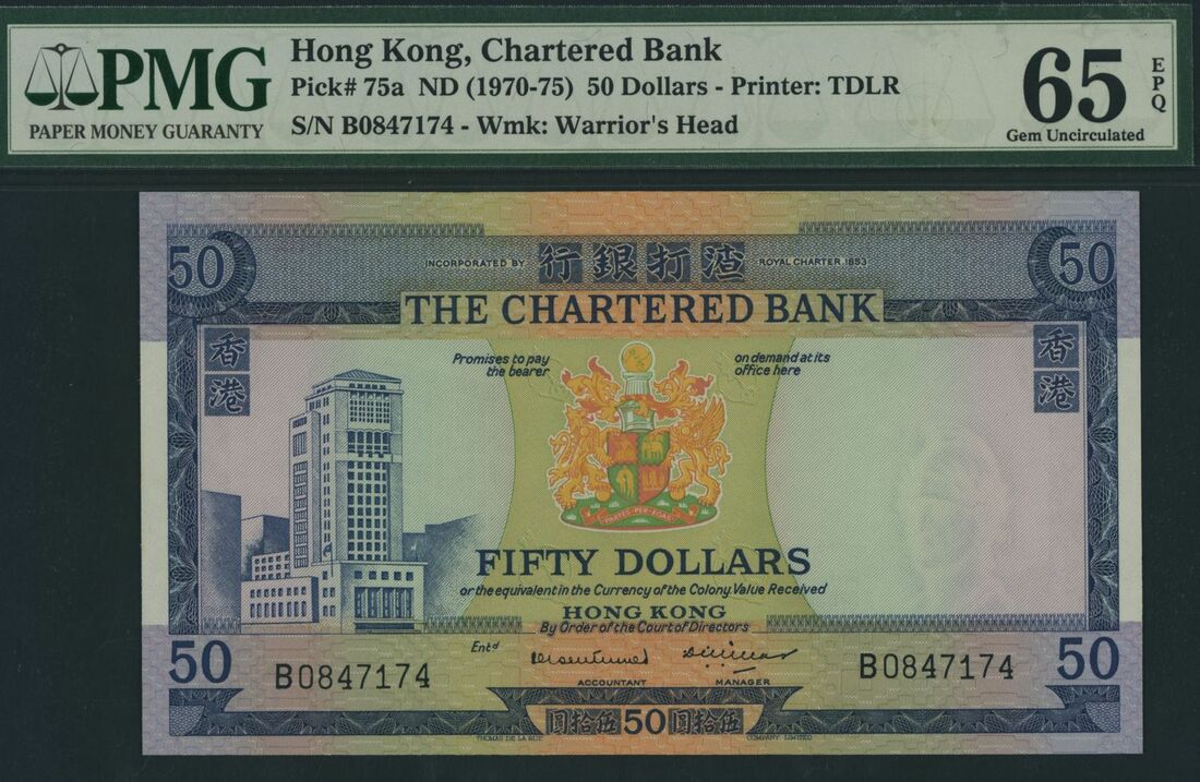 (x) The Chartered Bank, Hong Kong, 50 Dollars, ND (1970-75), serial number B0847174, (Pick 75a, KNB50a-b), in PMG holder 65 EPQ Gem Uncirculated