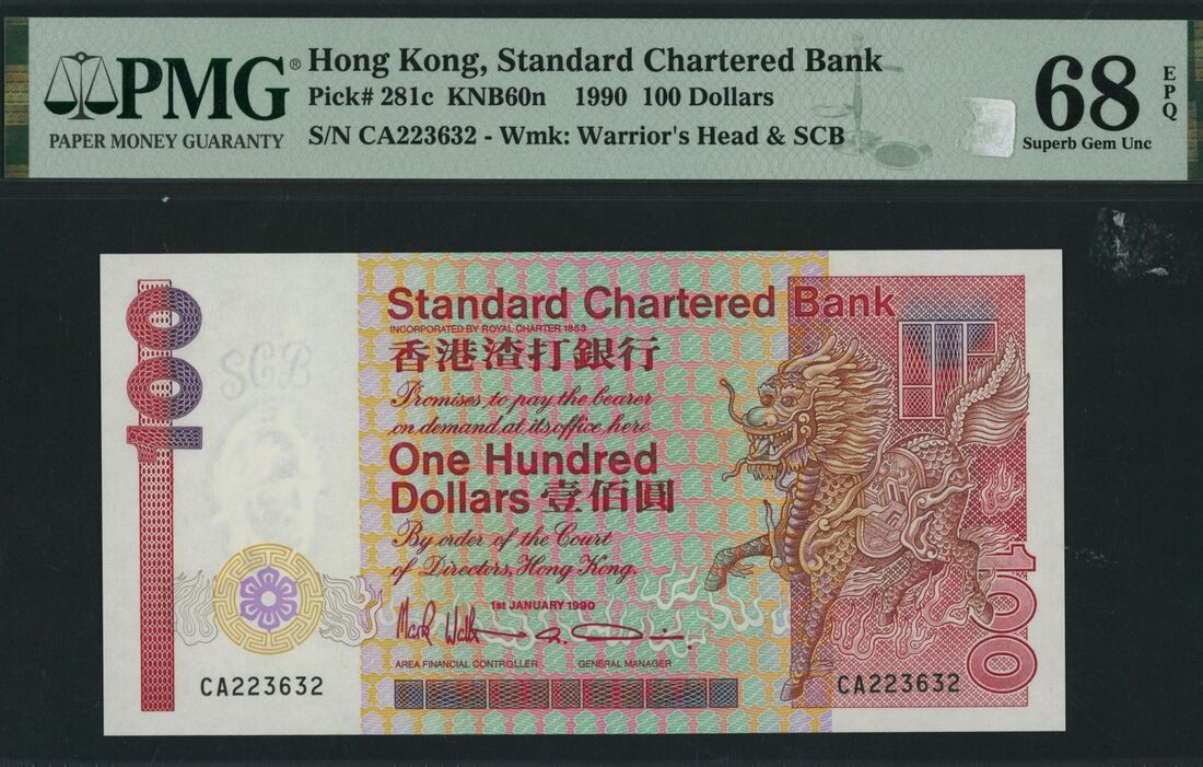 (x) Standard Chartered Bank, Hong Kong, [Top Pop] 100 Dollars, 1st January 1990, serial number CA223632, (Pick 281c, KNB60n), in PMG holder 68 EPQ Superb Gem Uncirculated, single finest graded on PMG census