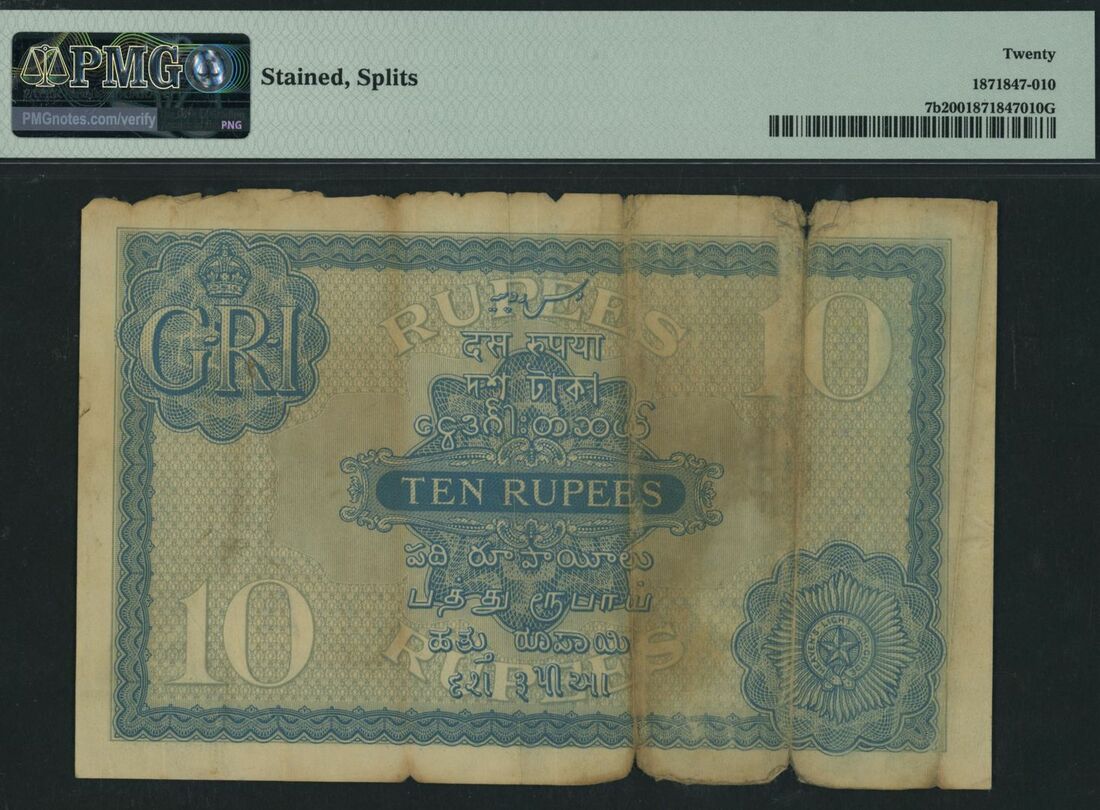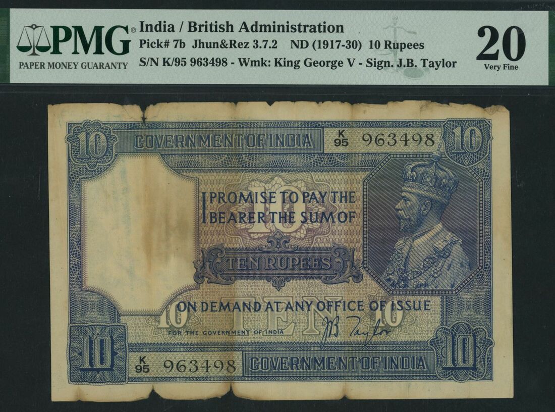 (x) Government of India, 10 Rupees, ND (1917-30), serial number K/95 963498, (Pick 7b, Jhun&Rez 3.7.2), in PMG holder 20 Very Fine, stained, splits