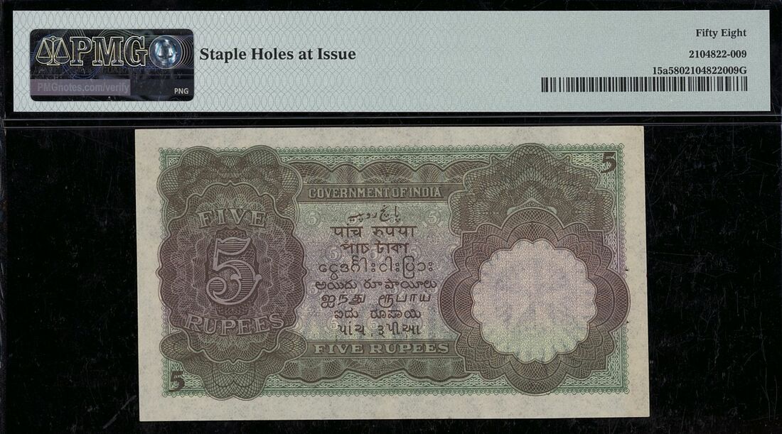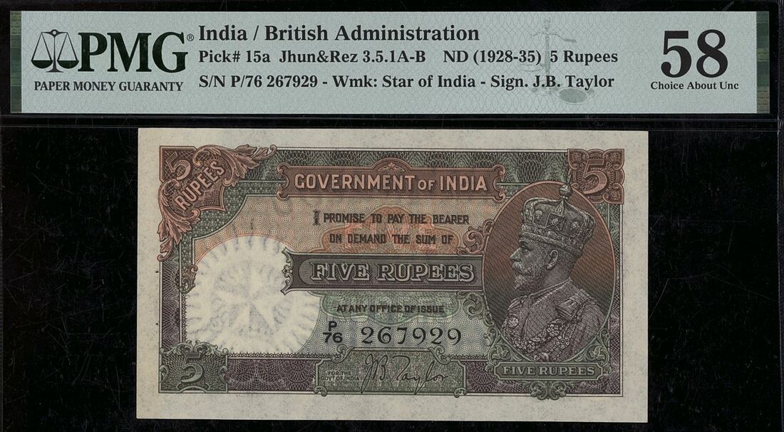 (x) Government of India, 5 Rupees, ND (1928-35), serial number P/76 267929, (Pick 15a, Jhun&Rez 3.5.1A-B), in PMG holder 58 Choice About Uncirculated, staple holes at issue