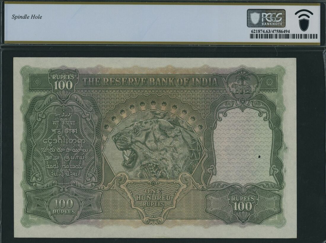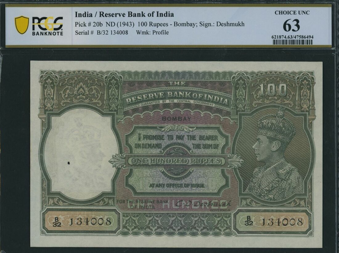 (x) Reserve Bank of India, 100 Rupees, ND (1943), serial number B/32 134008, (Pick 20b, BNB 204), in PCGS holder 63 Choice Uncirculated, spindle hole, only 2 notes in higher grades on PCGS census