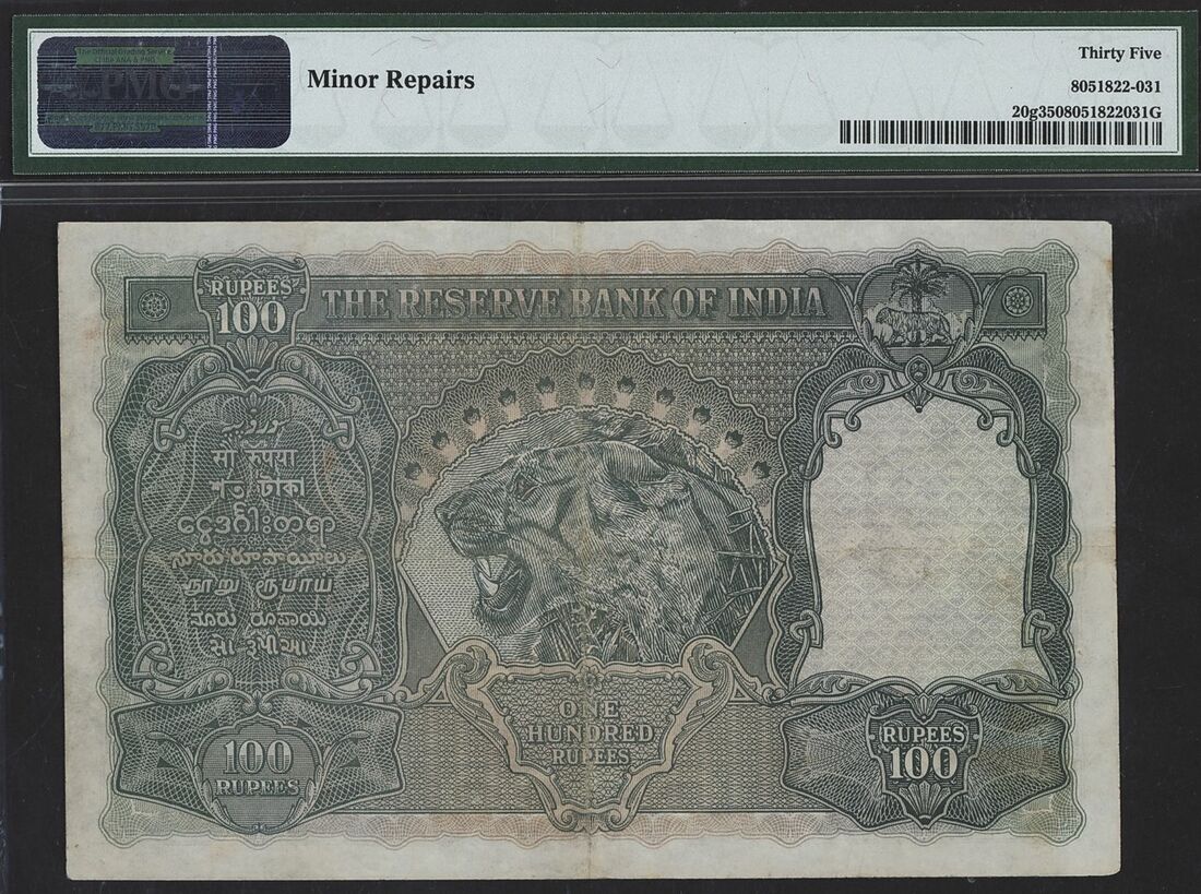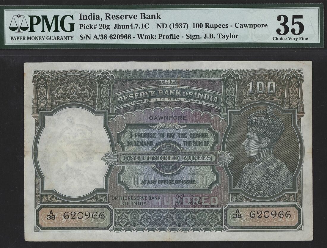 (x) Reserve Bank of India, 100 Rupees, ND (1937), serial number A/38 620966, (Pick 20g, Jhun&Rez 4.7.1C), in PMG holder 35 Choice Very Fine, minor repairs, only 4 notes graded higher on PMG census