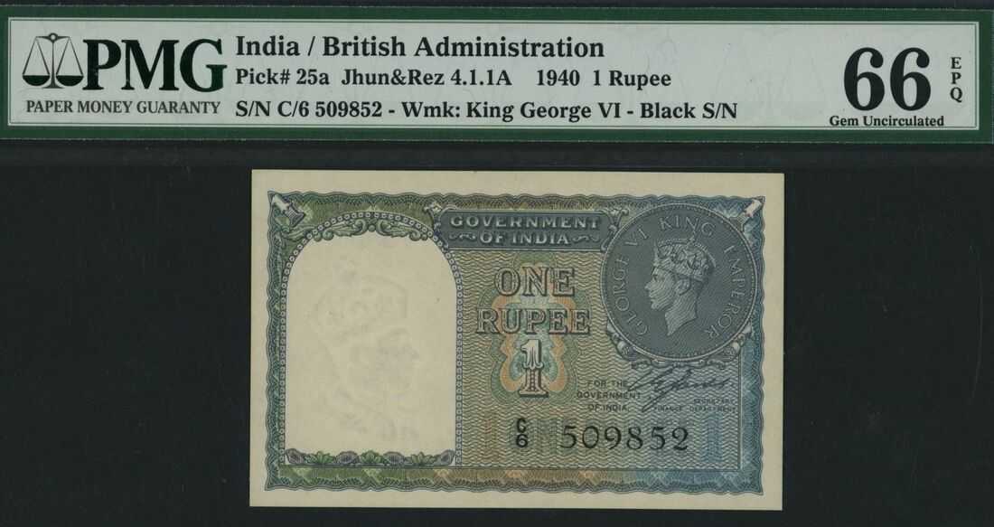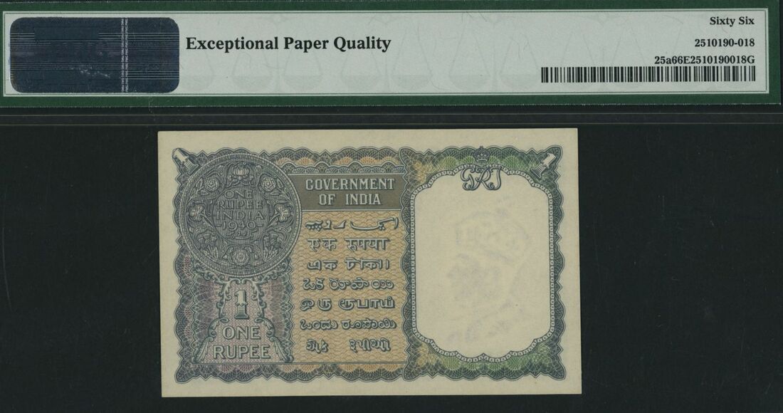 (x) Government of India, 1 Rupee, 1940, serial number C/6 509852, (Pick 25a, Jhun&Rez 4.1.1A), in PMG holder 66 EPQ Gem Uncirculated