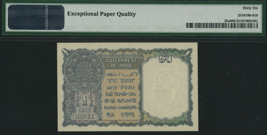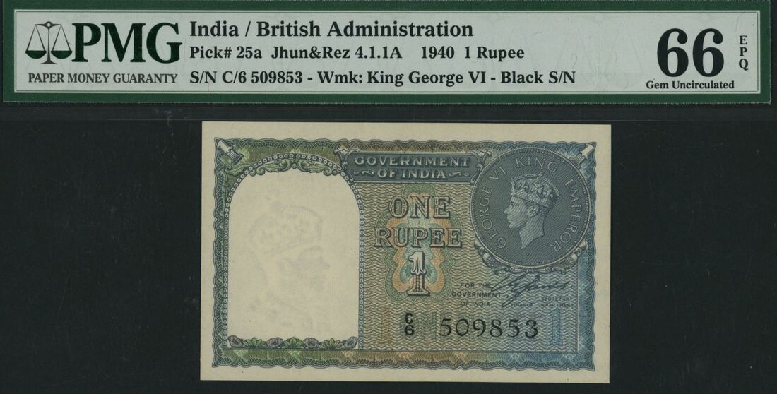 (x) Government of India, 1 Rupee, 1940, serial number C/6 509853, (Pick 25a, Jhun&Rez 4.1.1A), in PMG holder 66 EPQ Gem Uncirculated