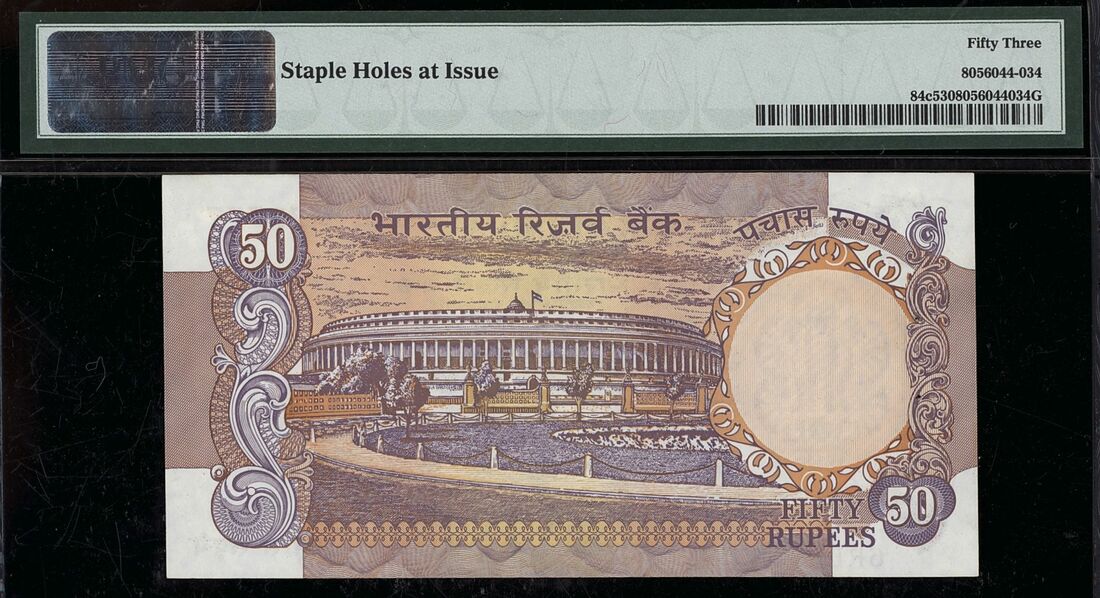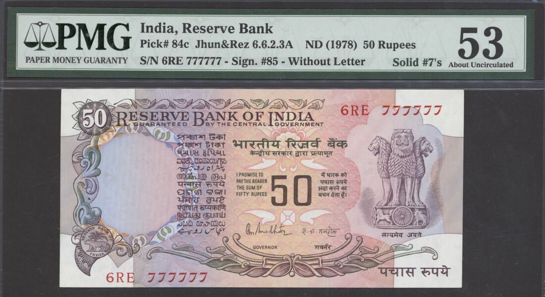 (x) Reserve Bank of India, 50 Rupees, ND (1978), serial number 6RE 777777, (Pick 84c, Jhun&Rez 6.6.2.3A), in PMG holder 53 About Uncirculated, staple holes at issue
