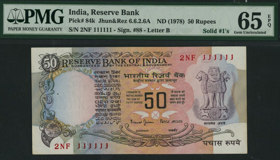 (x) Reserve Bank of India, [10 notes] 50 Rupees, ND (1978), with solid or fancy serial numbers, 2NF 111111, 3QL 222222, 7PU 333333, 0TV 444444, 1LM 555555, 9NS 666666, 6RE 777777, 3MT 888888, 3LK 999999, and Million serial number 7PH 1000000