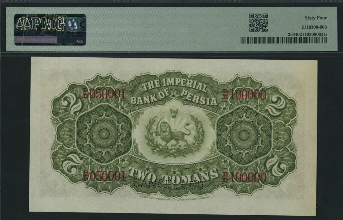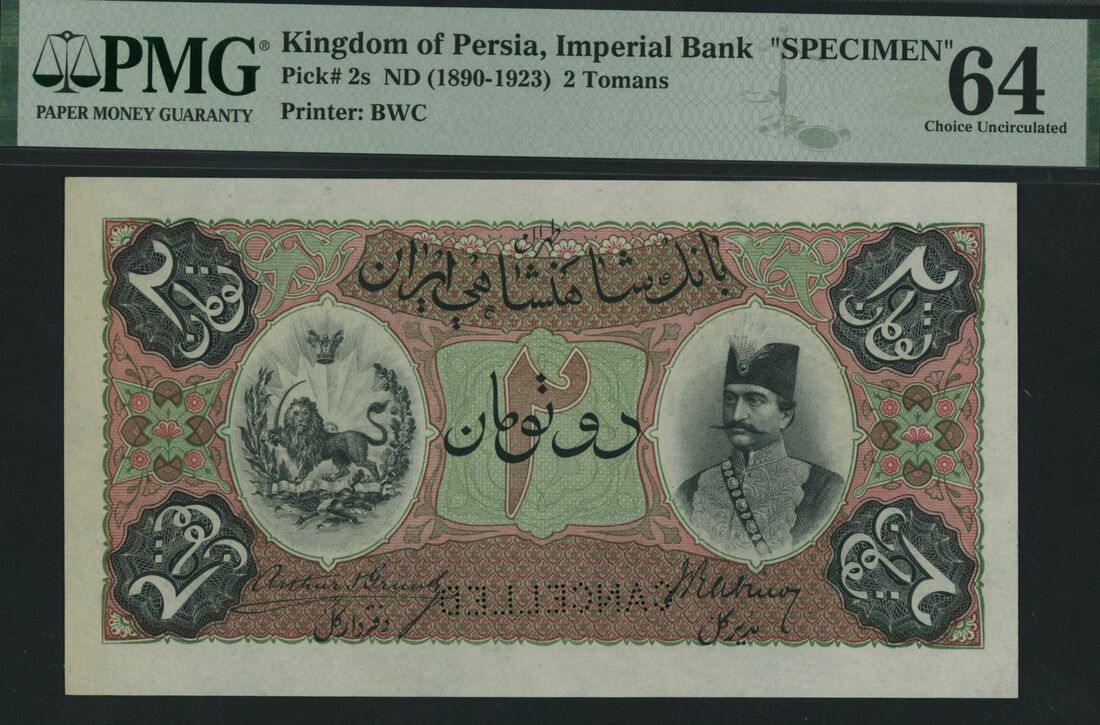 (x) Imperial Bank of Persia, specimen 2 Tomans, ND (1890, 1923), red serial number range B/B 050001 - B/B 100000, (Pick 2s, BNB 103), in PMG holder 64 Choice Uncirculated, only 5 notes in higher grades on PMG census