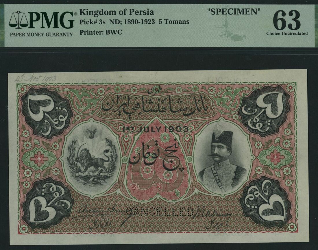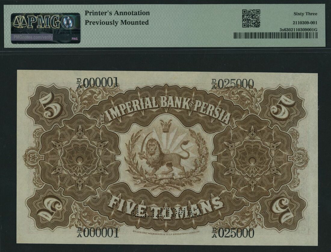 (x) Imperial Bank of Persia, specimen 5 Tomans, 1st July 1903, serial number range D/A 000001 - D/A 025000, (Pick 3s, BNB 105), in PMG holder 63 Choice Uncirculated, printer´s annotation, previously mounted