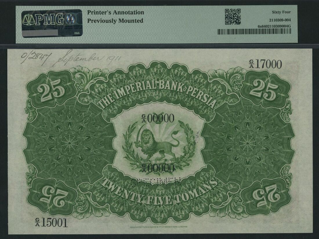 (x) Imperial Bank of Persia, specimen 25 Tomans, ND (1890-1923), serial number range G/A 15001 - G/A 17000,