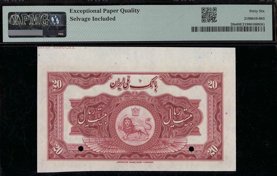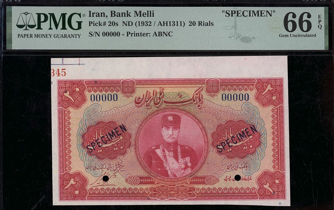 (x) Bank Melli, Iran, specimen 20 Rials, ND (1932 / AH1317), serial number 00000 345, (Pick 20s, BNB 103), in PMG holder 66 EPQ Gem Uncirculated, selvage included, only 3 notes in higher grades on PMG census