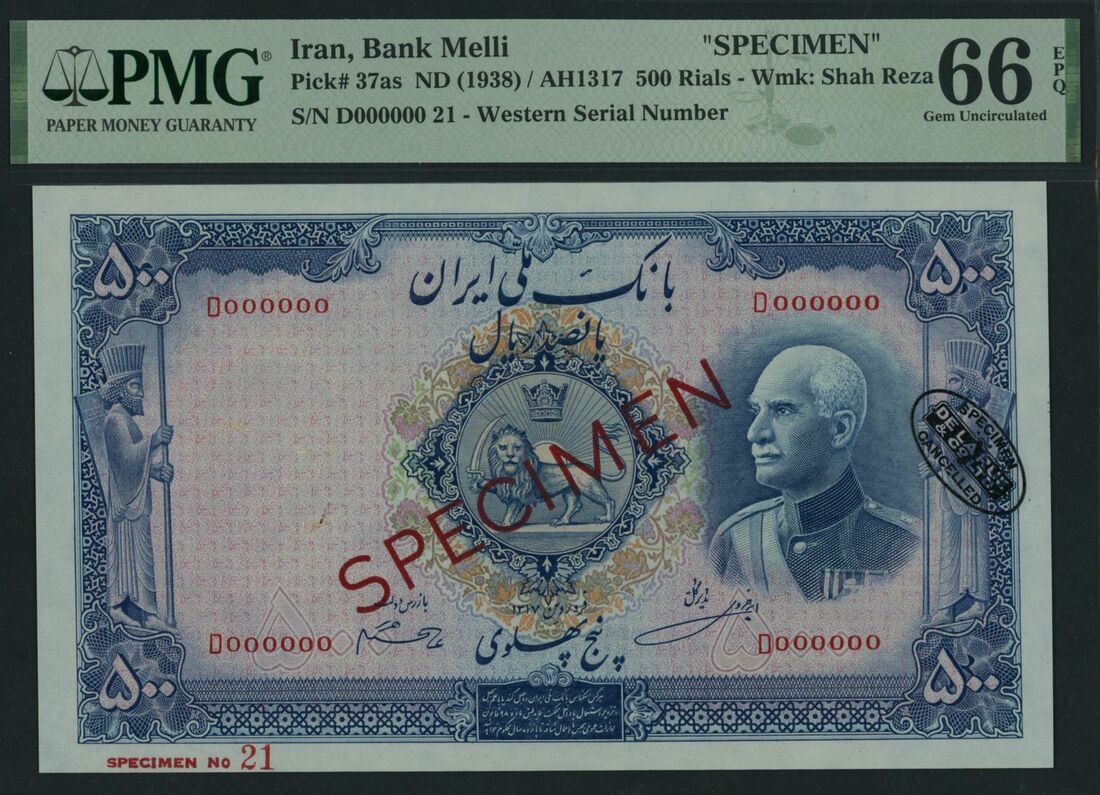 (x) Bank Melli, Iran, specimen 500 Rials, ND (1938) / AH1317, serial number D000000 21, (Pick 37as, BNB 131), in PMG holder 66 EPQ Gem Uncirculated, only 1 note in higher grade on PMG census