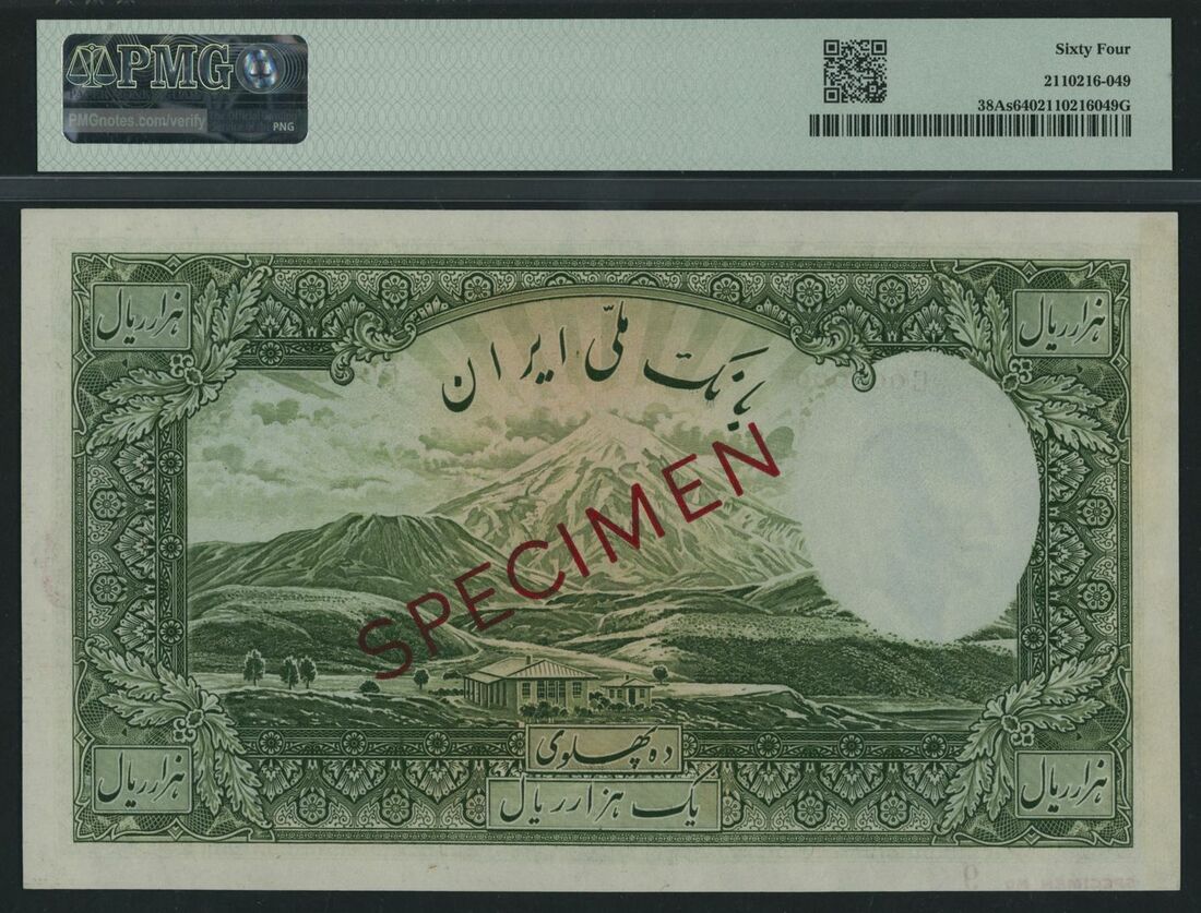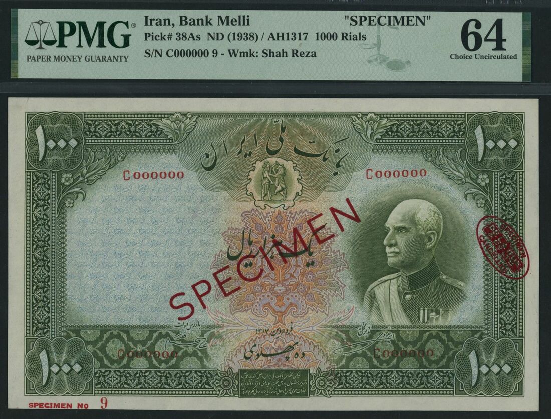 (x) Bank Melli, Iran, specimen 1000 Rials, ND (1938) / AH1317, serial number C000000 9, (Pick 38As, BNB 132), in PMG holder 64 Choice Uncirculated, only 4 notes in higher grades on PMG census
