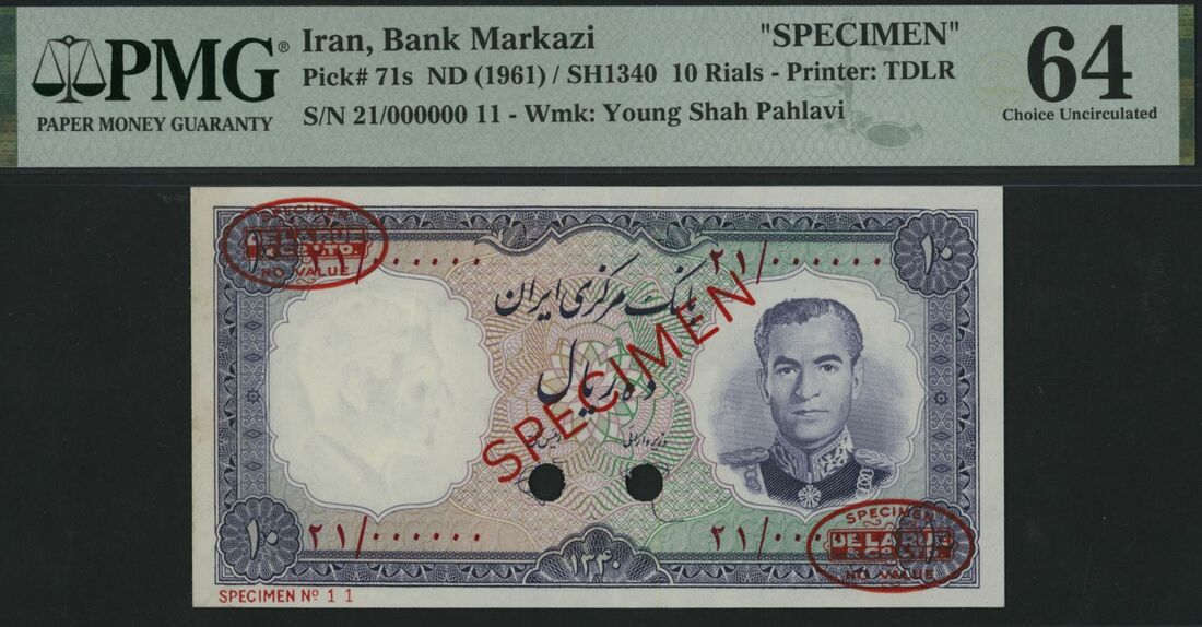 (x) Bank Markazi, Iran, specimen 10 Rials ND (1961) / SH1340, serial number 21/000000 11, (Pick 71s, BNB 201), in PMG holder 64 Choice Uncirculated, previously mounted