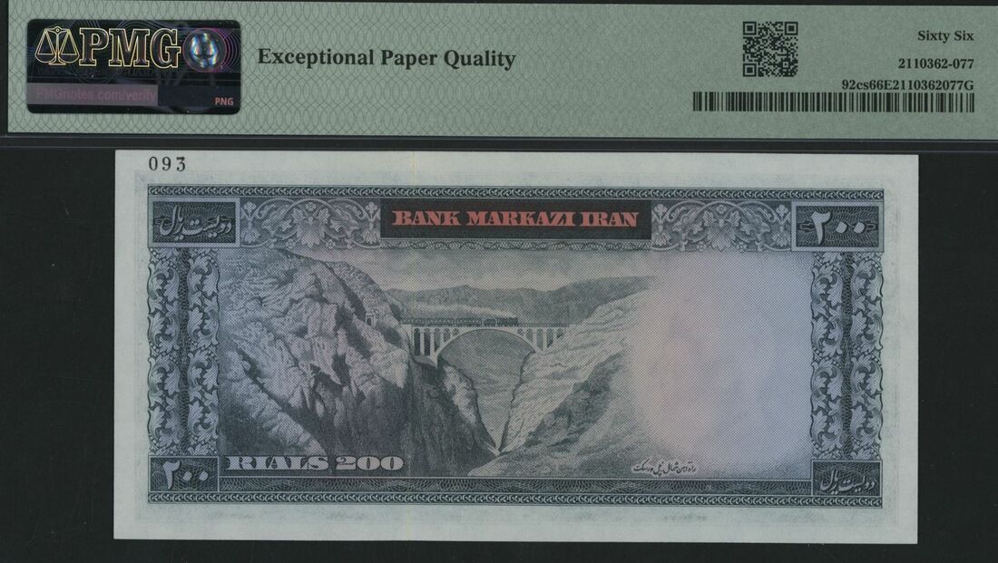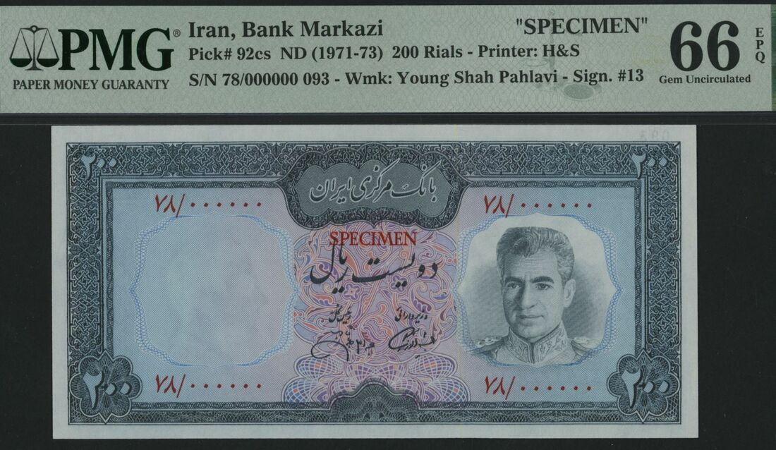 (x) Bank Markazi, Iran, specimen 200 Rials, ND (1971-73), serial number 78/000000 093, (Pick 92cs, BNB 223), in PMG holder 66 EPQ Gem Uncirculated, only 2 notes in higher grades on PMG census