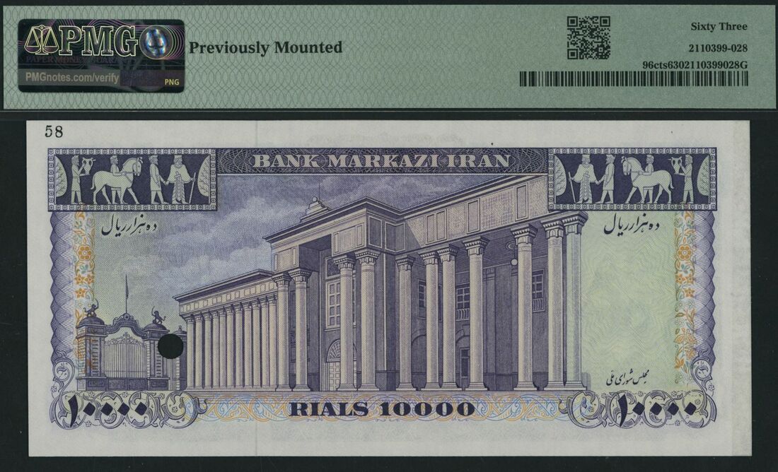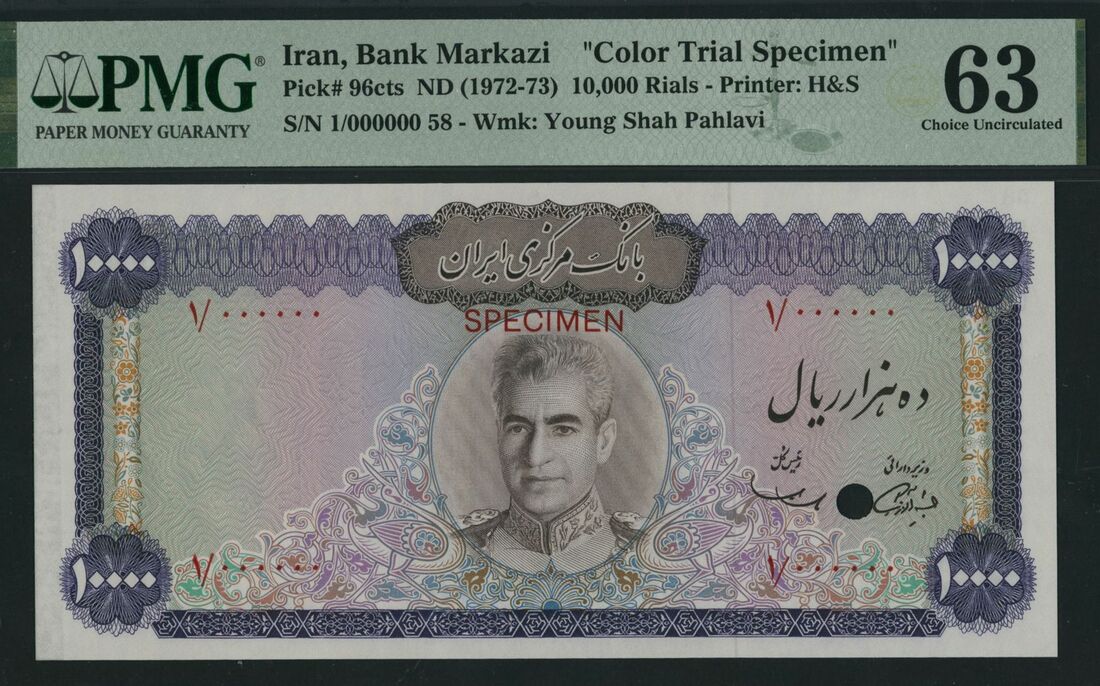 (x) Bank Markazi, Iran, colour trial specimen 10,000 Rials, ND (1972-73), serial number 1/000000 58, (Pick 96cts, BNB 227), in PMG holder 63 Choice Uncirculated, previously mounted, only 1 note in higher grade on PMG census
