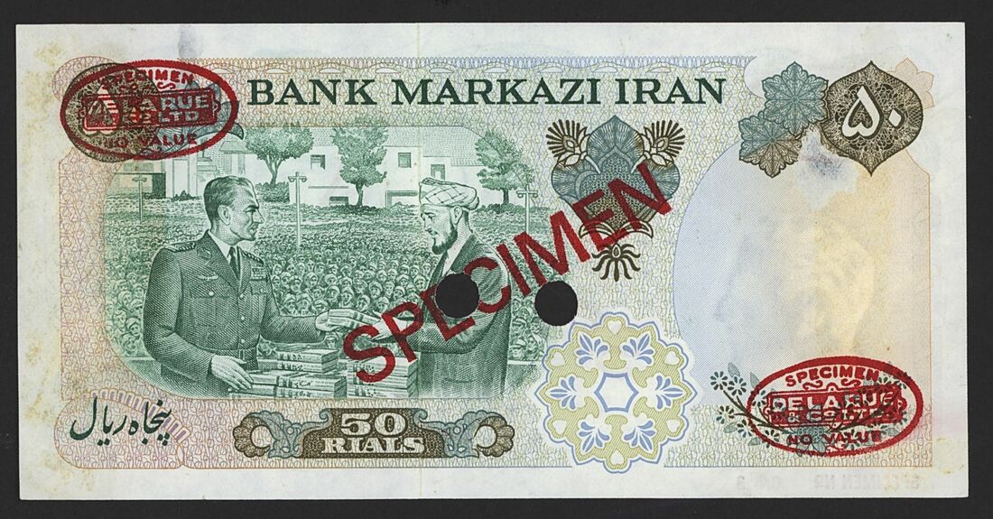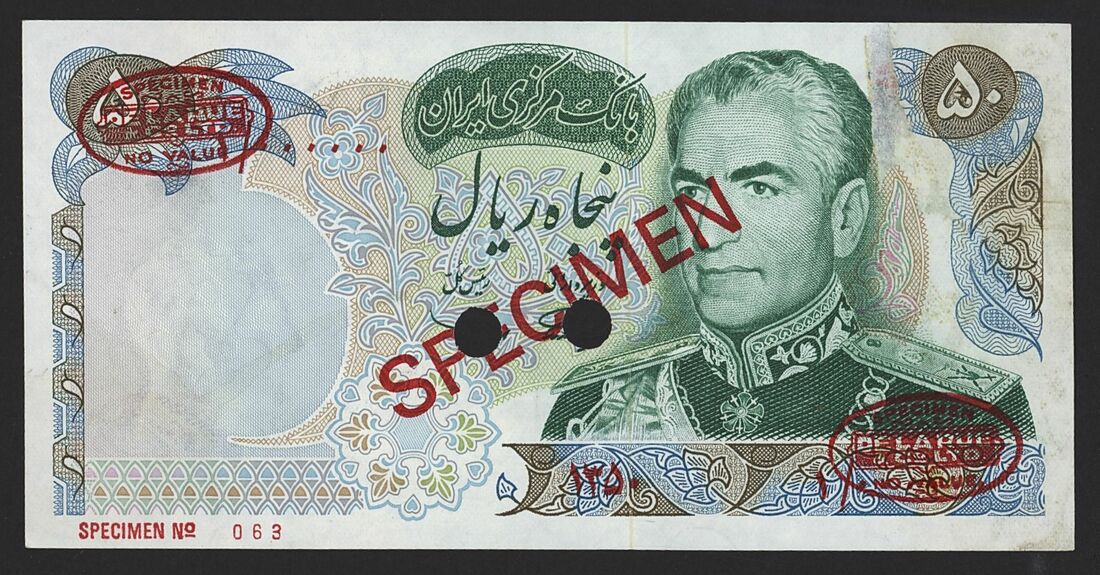 (x) Bank Markazi, Iran, specimen 50 Rials, ND (1974-79), serial number 1/000000 063, (Pick 101s, BNB 231), good extremely fine, some creasing and glue remnants, paper thinning at right of the portrait