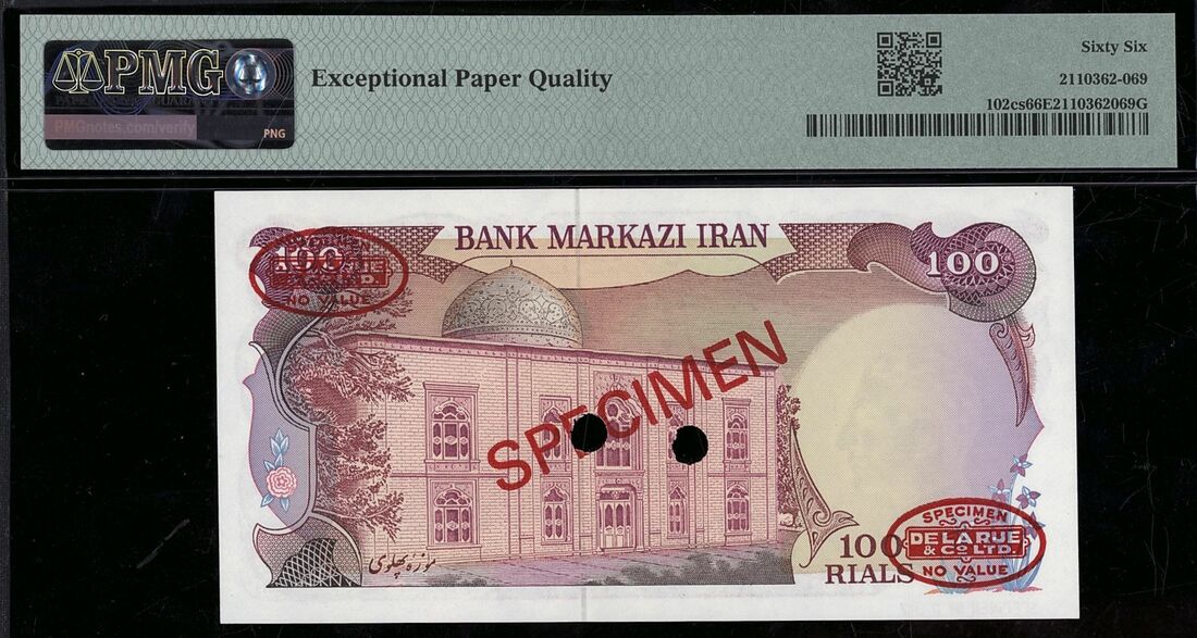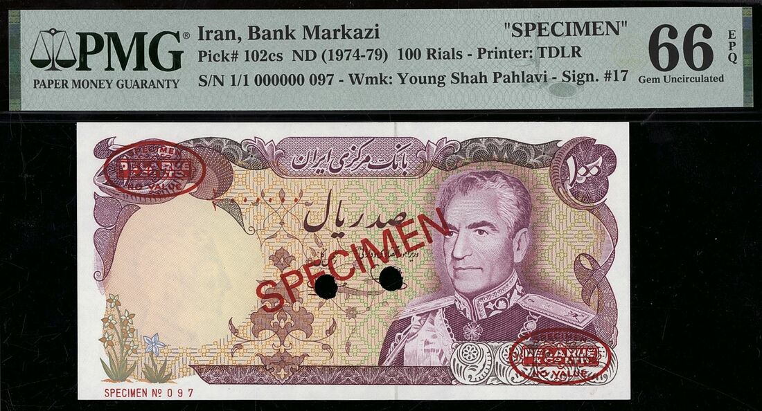(x) Bank Markazi, Iran, specimen 100 Rials, ND (1974-79), serial number 1/1 000000 097, (Pick 102cs, BNB 232), in PMG holder 66 EPQ Gem Uncirculated