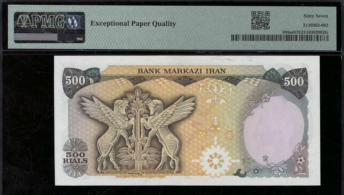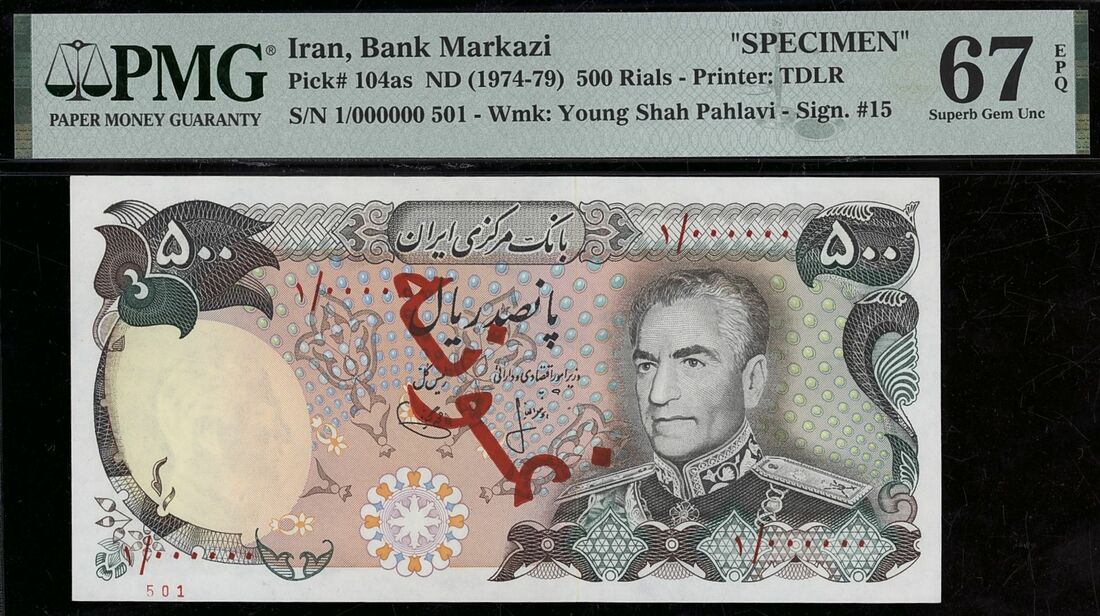 (x) Bank Markazi, Iran, specimen 500 Rials, ND (1974-79), serial number 1/000000 501, (Pick 104as, BNB 235), in PMG holder 67 EPQ Superb Gem Uncirculated, only 1 note graded higher on PMG census