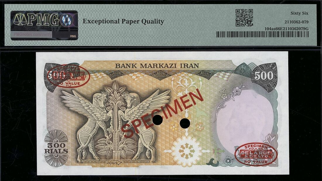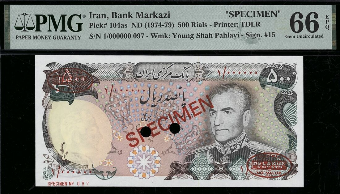 (x) Bank Markazi, Iran, specimen 500 Rials, ND (1974-79), serial number 1/000000 097, (Pick 104as, BNB 235), in PMG holder 66 EPQ Gem Uncirculated