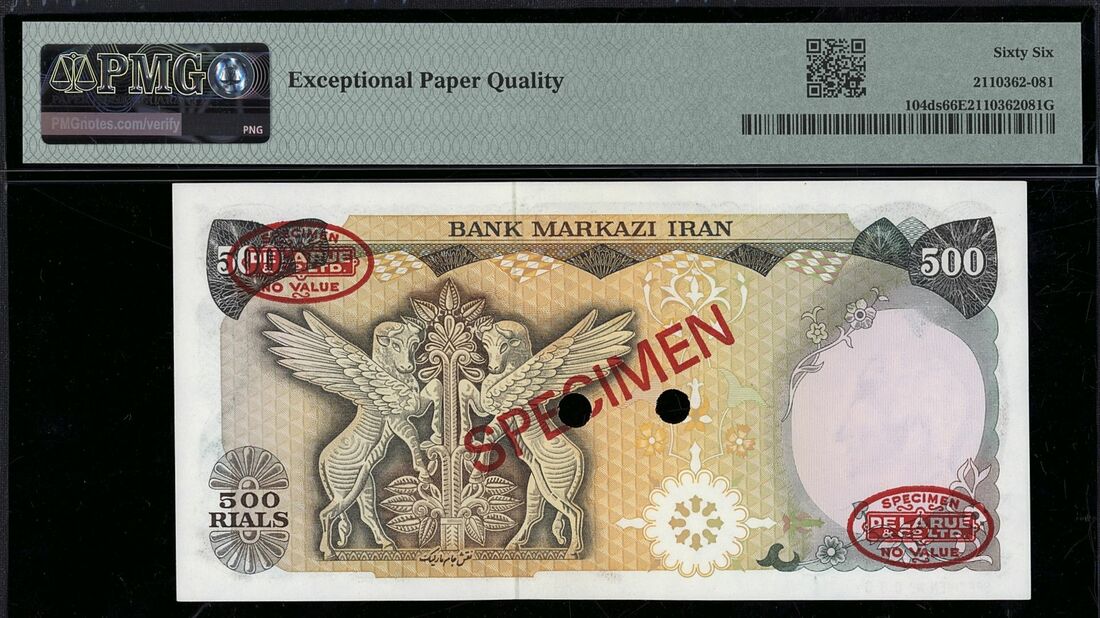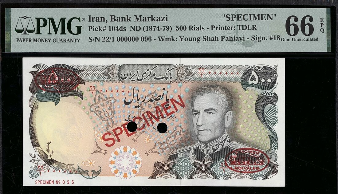 (x) Bank Markazi, Iran, specimen 500 Rials ND (1974-79), serial number 22/1 000000 096, (Pick 104ds, BNB 236), in PMG holder 66 EPQ Gem Uncirculated