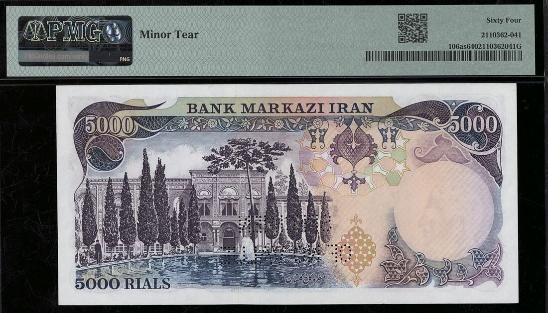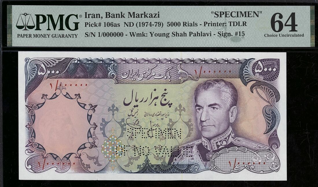 (x) Bank Markazi, Iran, specimen 5000 Rials, ND (1974-79), serial number 1/000000, (Pick 106as, BNB 238), in PMG holder 64 Choice Uncirculated, minor tear