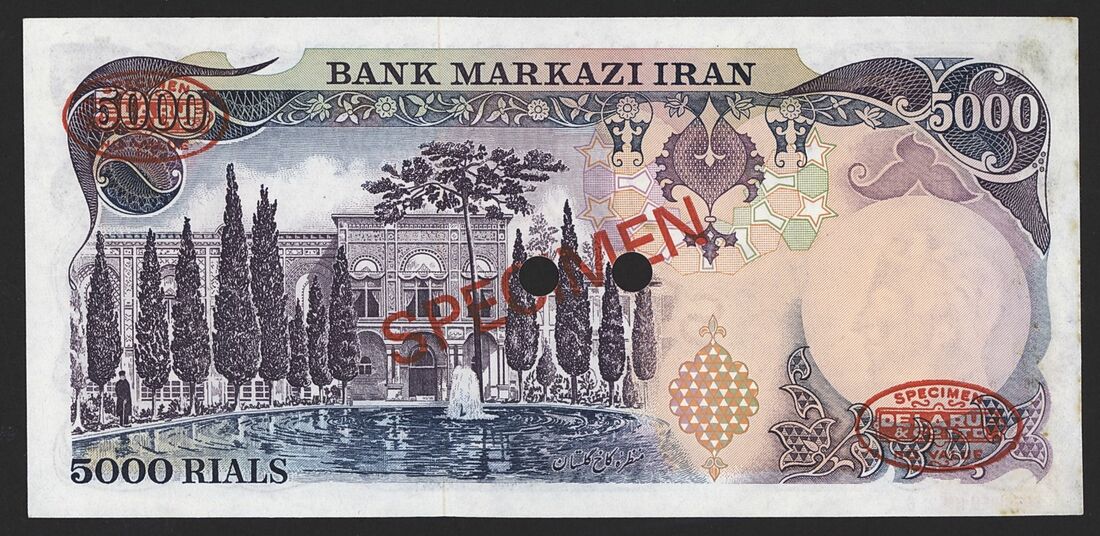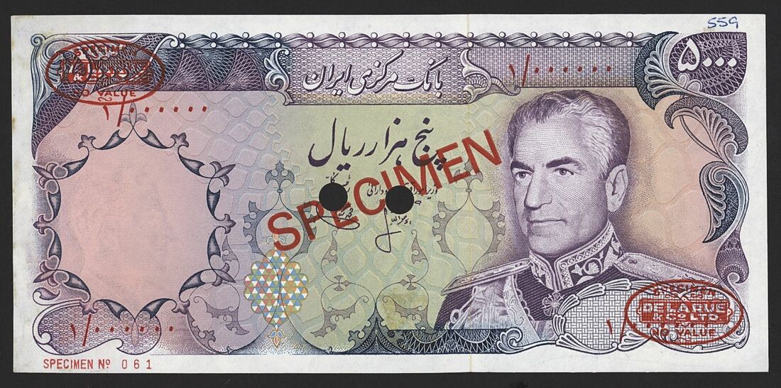 (x) Bank Markazi, Iran, specimen 5000 Rials, ND (1974-79), serial number 1/000000 061, (Pick 106s, BNB 238as), good extremely fine, some creasing and glue remnants