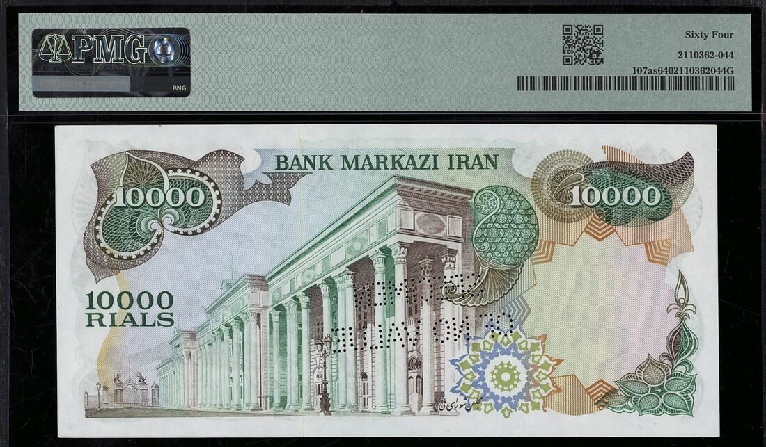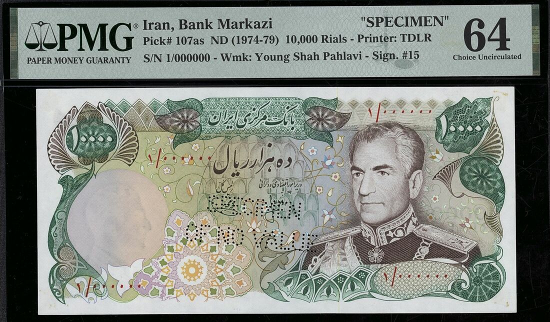 (x) Bank Markazi, Iran, specimen 10,000 Rials, ND (1974-79), serial number 1/000000, (Pick 107as, BNB 239), in PMG holder 64 Choice Uncirculated