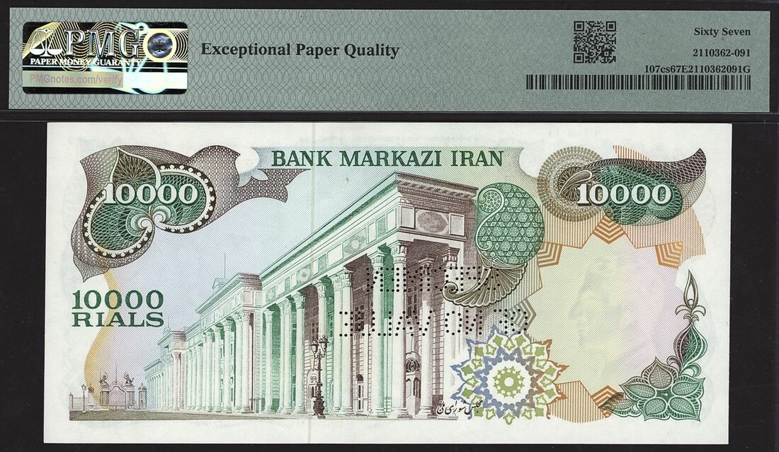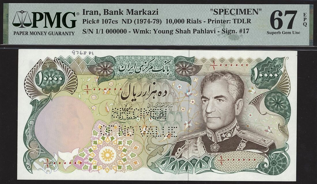 (x) Bank Markazi, Iran, specimen, 10,000 Rials ND (1974-79), serial number 1/1 000000, (Pick 107cs, BNB 239), in PMG holder 67 EPQ Superb Gem Uncirculated, only 1 note graded higher at PMG census