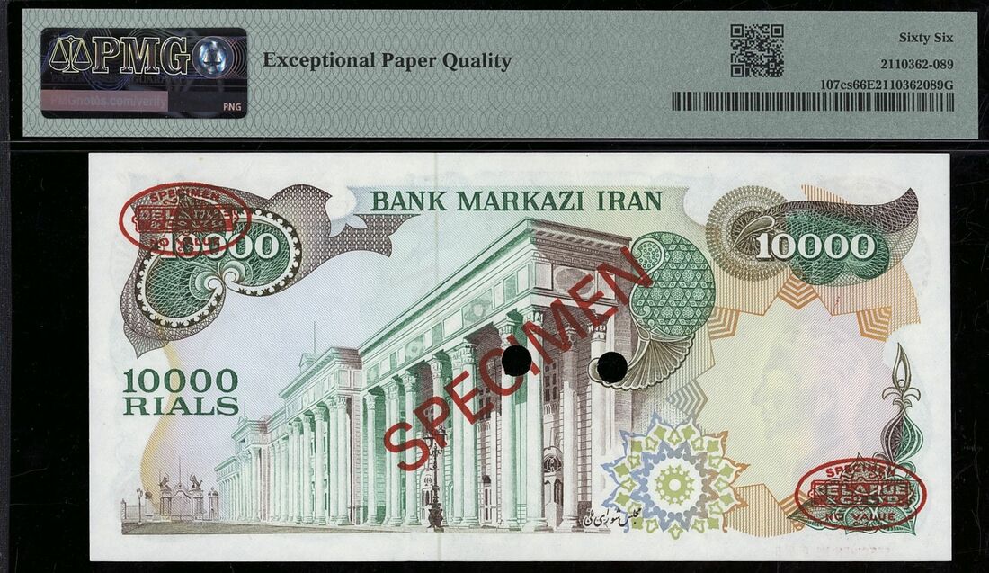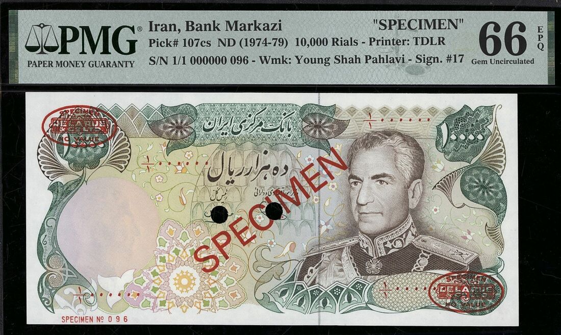 (x) Bank Markazi, Iran, specimen 10,000 Rials, ND (1974-79), serial number 1/1 000000 096, (Pick 107cs, BNB 239), in PMG holder 66 EPQ Gem Uncirculated
