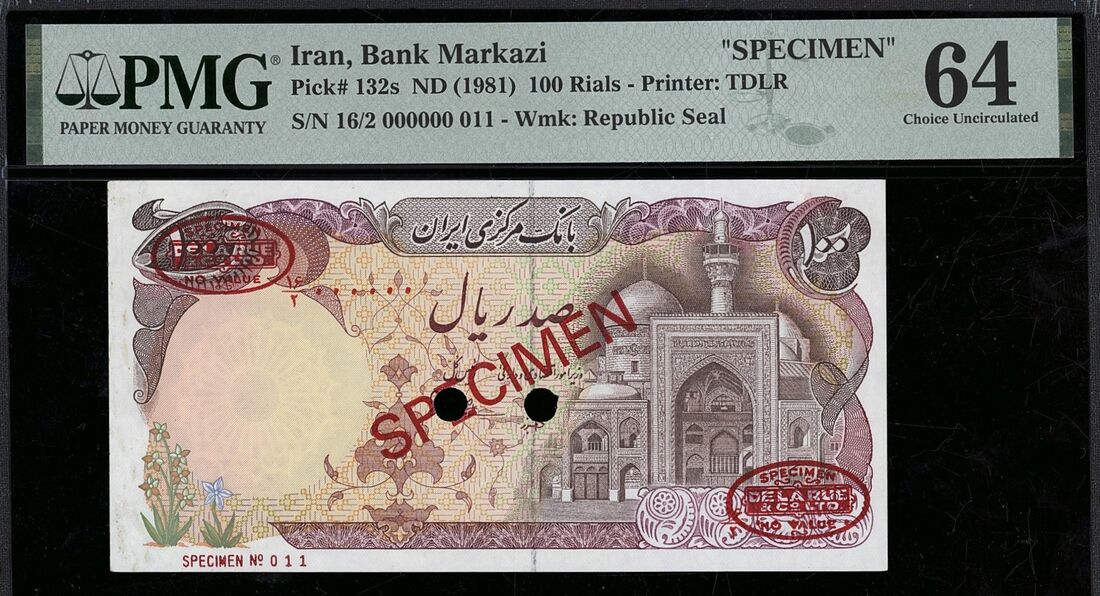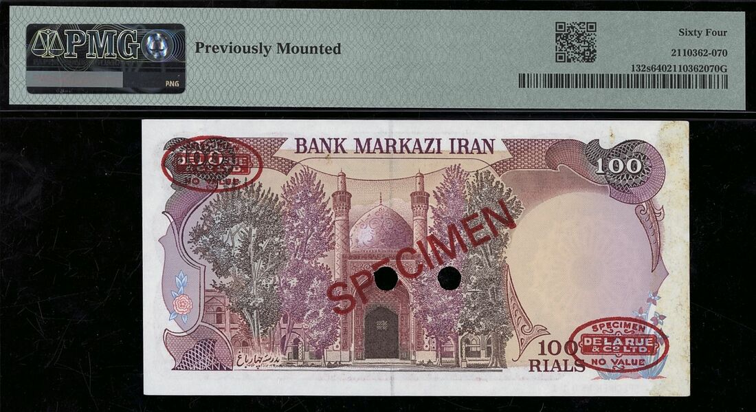 (x) Bank Markazi, Iran, specimen 100 Rials, ND (1981), serial number 16/2 000000 011, (Pick 132s, BNB 267), in PMG holder 64 Choice Uncirculated, previously mounted