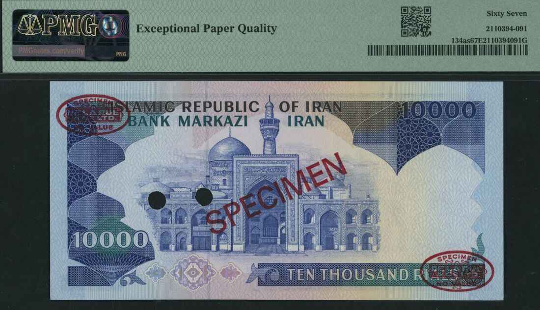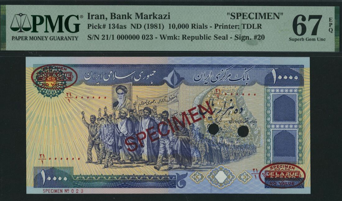 (x) Bank Markazi, Iran, specimen 10,000 Rials, ND (1981), serial number 21/1 000000 023, (Pick 134as, BNB 274), in PMG holder 67 EPQ Superb Gem Uncirculated, only 1 note graded higher on PMG census