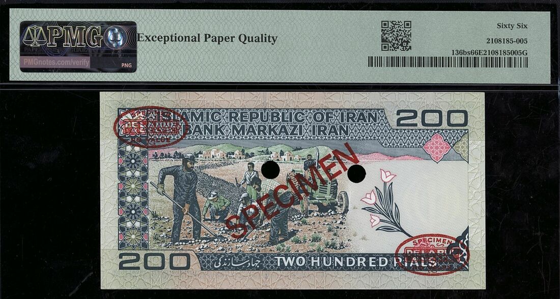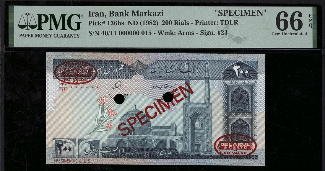 (x) Bank Markazi, Iran, specimen 200 Rials, ND (1982), serial number 40/11 000000 015, (Pick 136bs, BNB 268), in PMG holder 66 EPQ Gem Uncirculated, only 1 note graded higher on PMG census