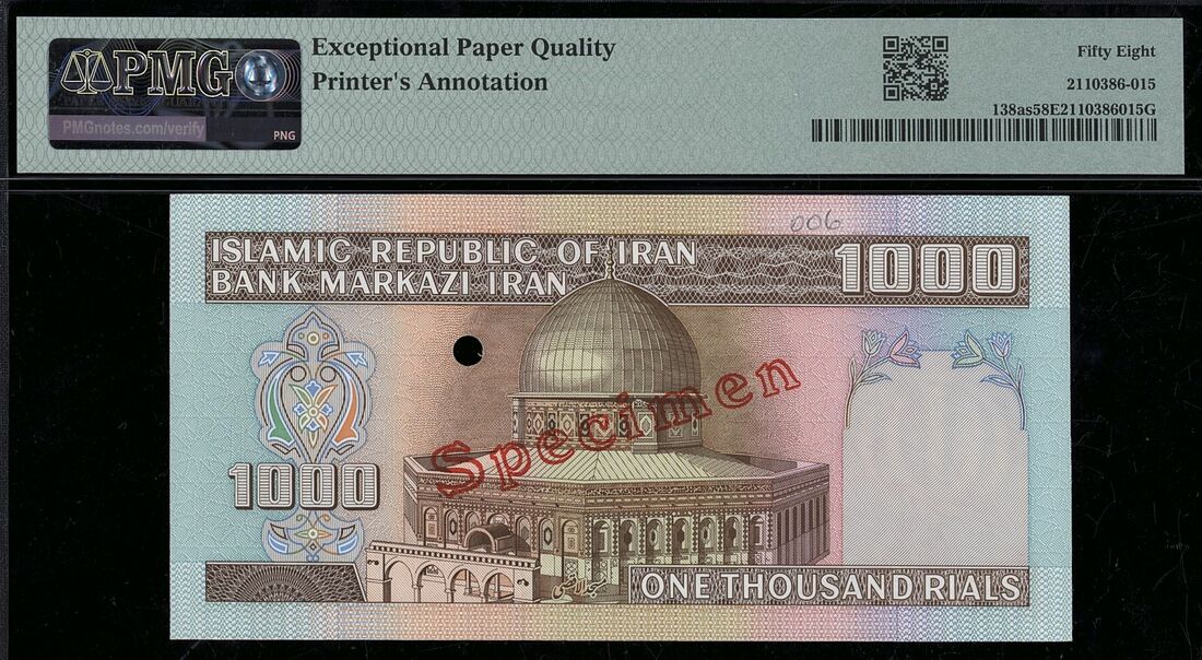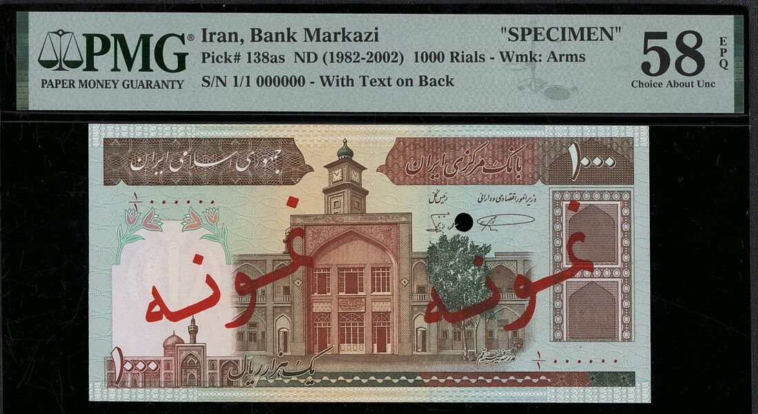 (x) Bank Markazi, Iran, specimen 1000 Rials, ND (1982-2002), serial number 1/1 000000, (Pick 138as, BNB 271), in PMG holder 58 EPQ Choice About Uncirculated, printer's annotation