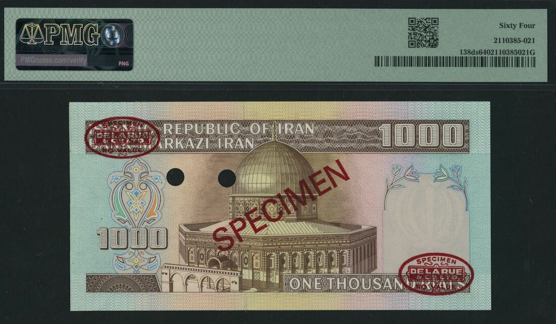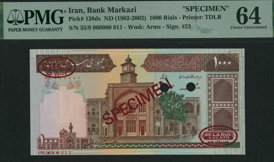 (x) Bank Markazi, Iran, [Top Pop] specimen 1000 Rials, ND (1982-2002), serial number 55/9 000000 011, (Pick 138ds, BNB 271), in PMG holder 64 Choice Uncirculated, single finest graded on PMG census