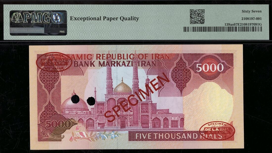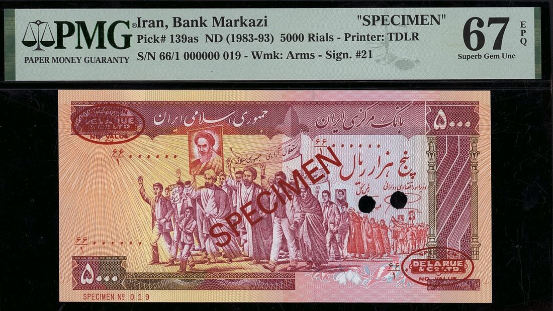(x) Bank Markazi, Iran, [Top Pop] specimen 5000 Rials, ND (1983-93), serial number 66/1 000000 019, (Pick 139as, BNB 273), in PMG holder 67 EPQ Superb Gem Uncirculated, single finest graded on PMG census