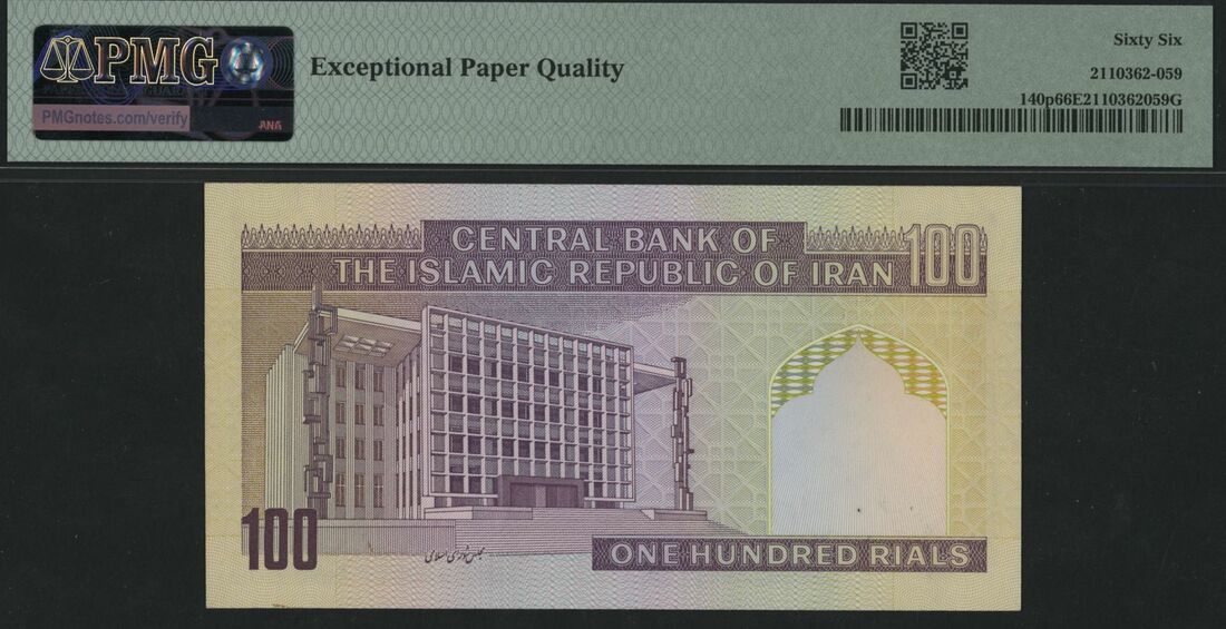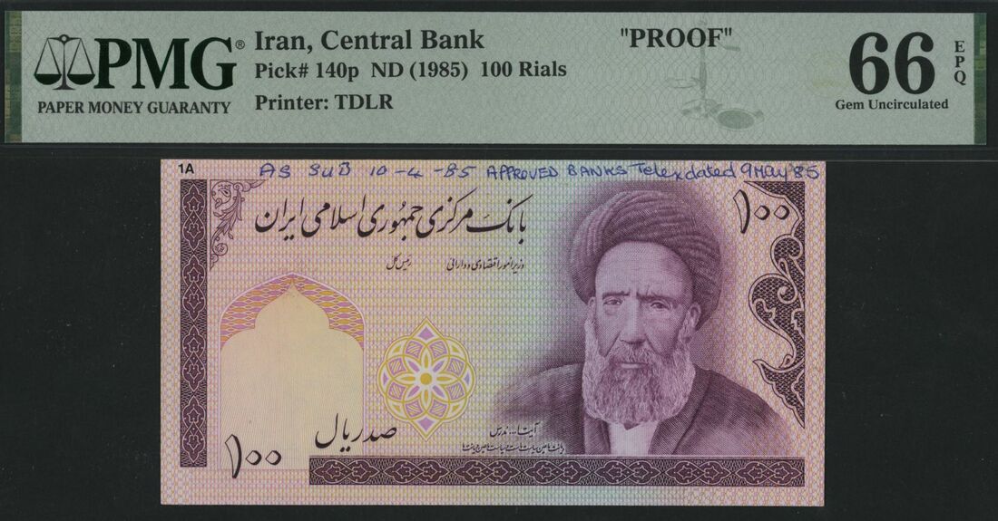 (x) Central Bank of Iran, [Top Pop] proof 100 Rials, ND (1985), (Pick 140p, BNB 275), in PMG holder 66 EPQ Gem Uncirculated, single finest graded on PMG census